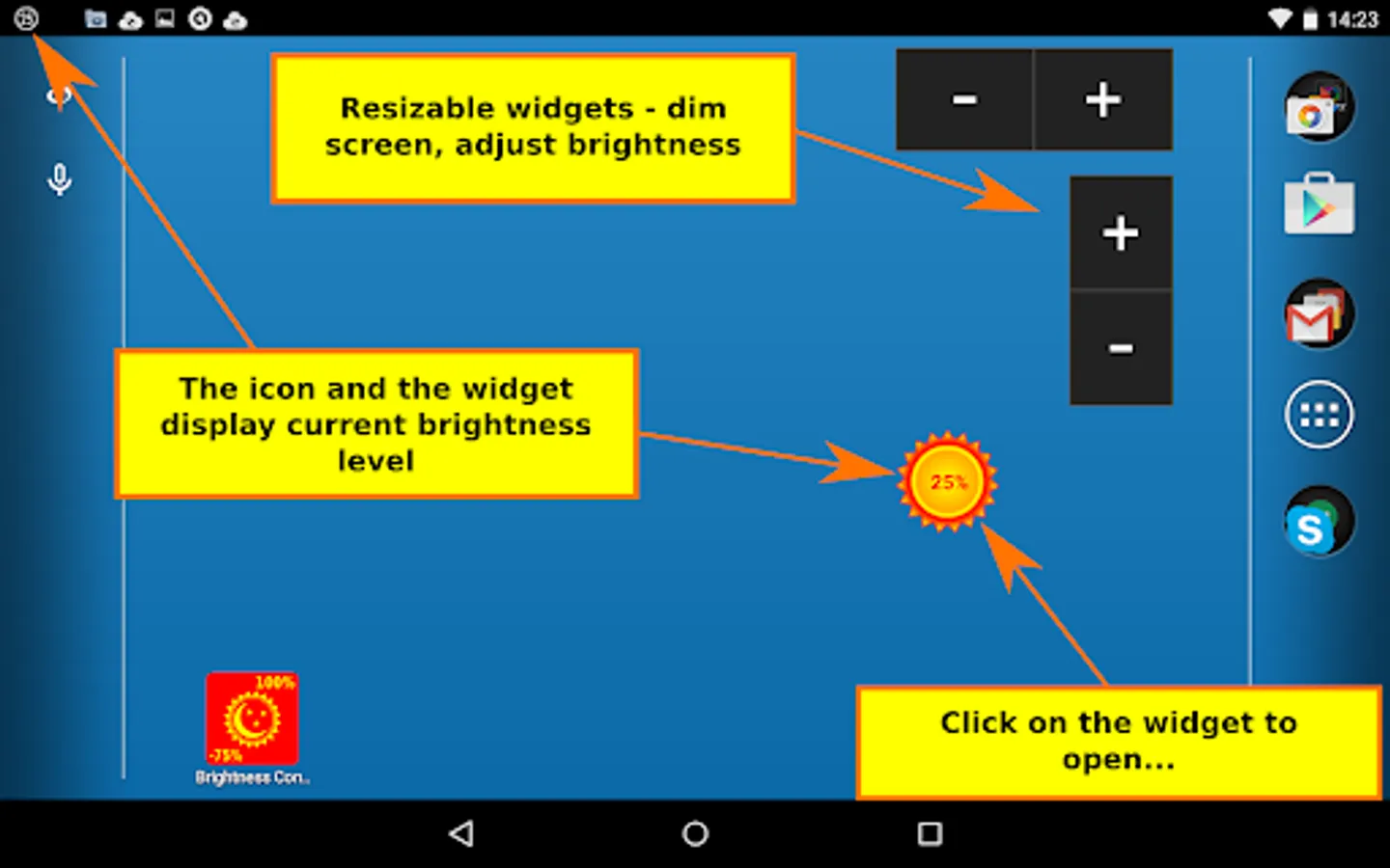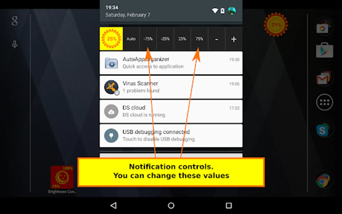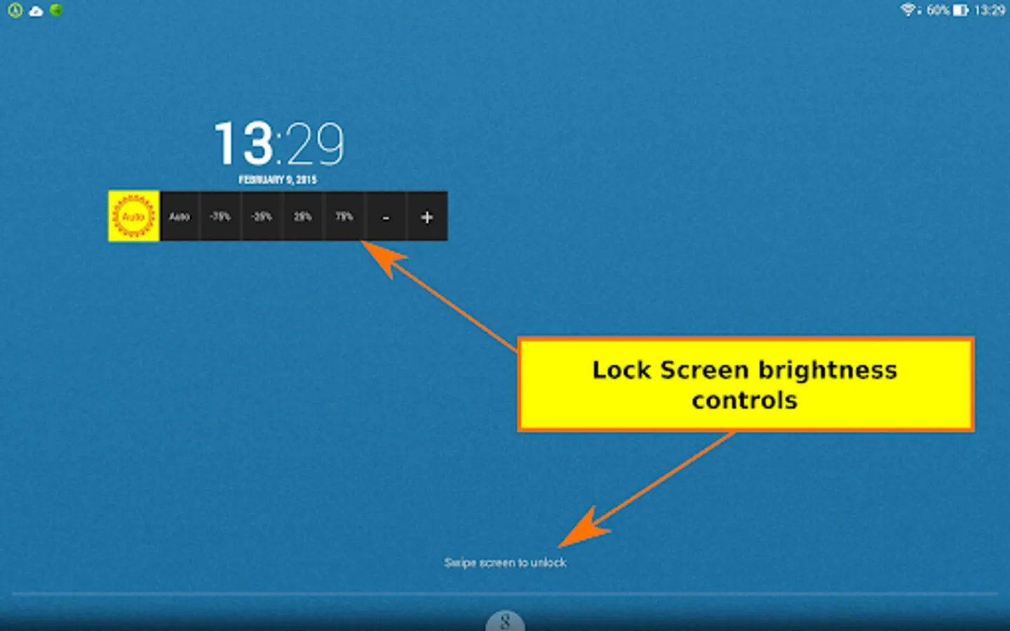 ● Your can control brightness even on the lock screen (supported in android 4.2 and above). For Android 5 devices the notification brightness controls should be available on your lock screen by default. You can find instructions inside the app that explain how to enable it on pre Android 5 devices.