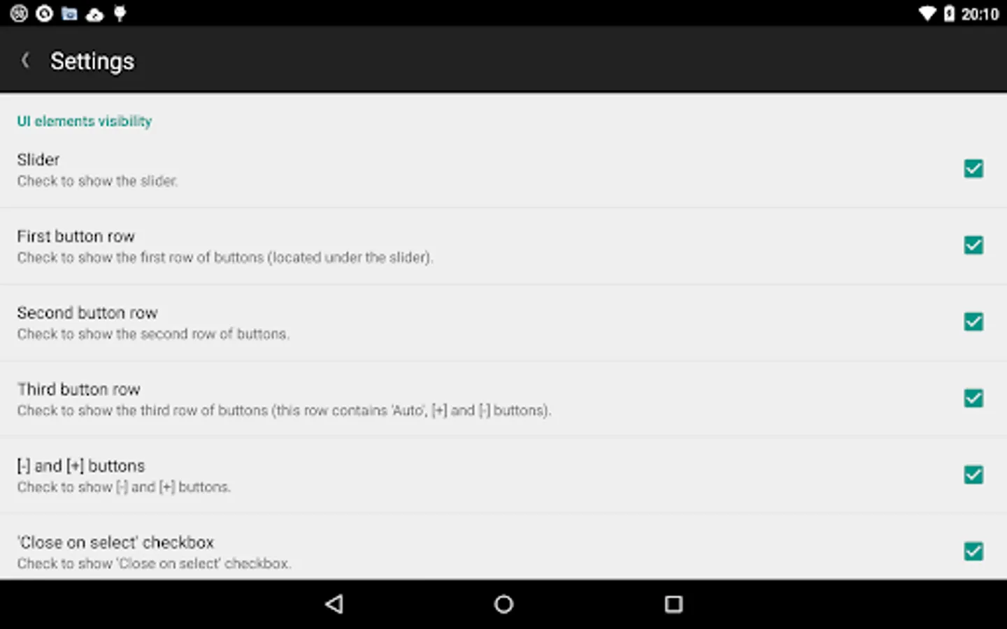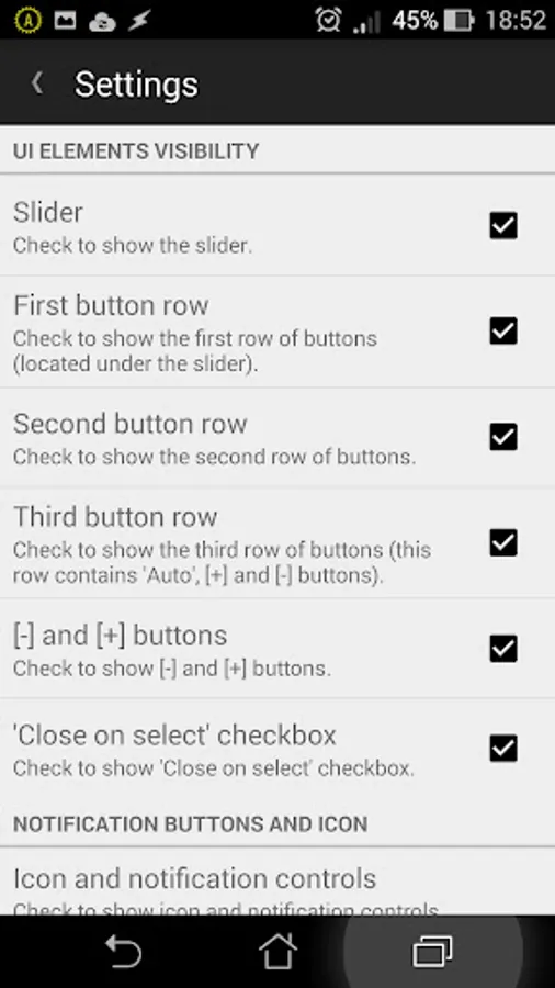 ● You can configure the appearance of the brightness controls: you can show or hide UI elements as you like. Hide unnecessary brightness buttons if you need only a slider, or hide the slider and use only buttons, or use both of them.