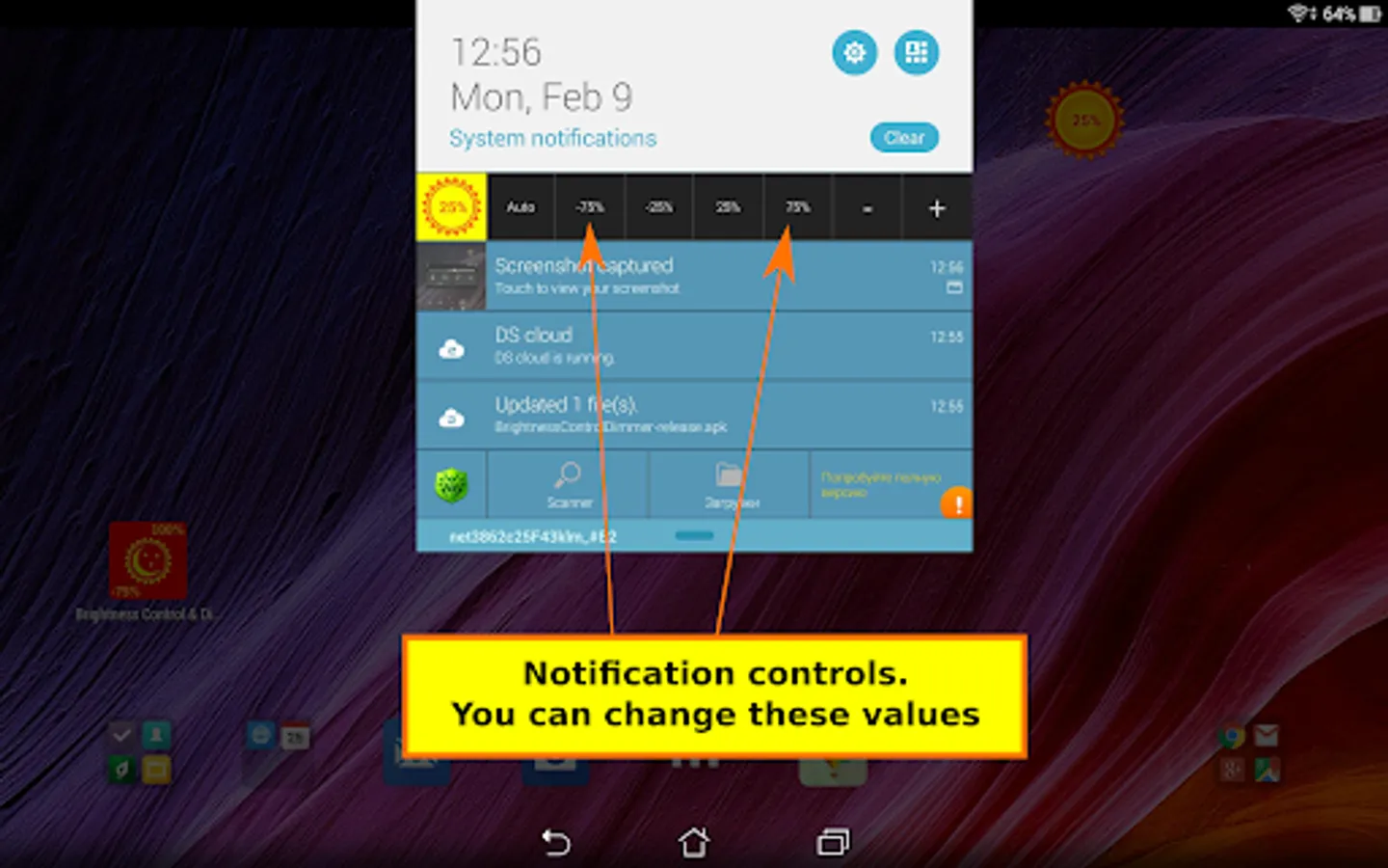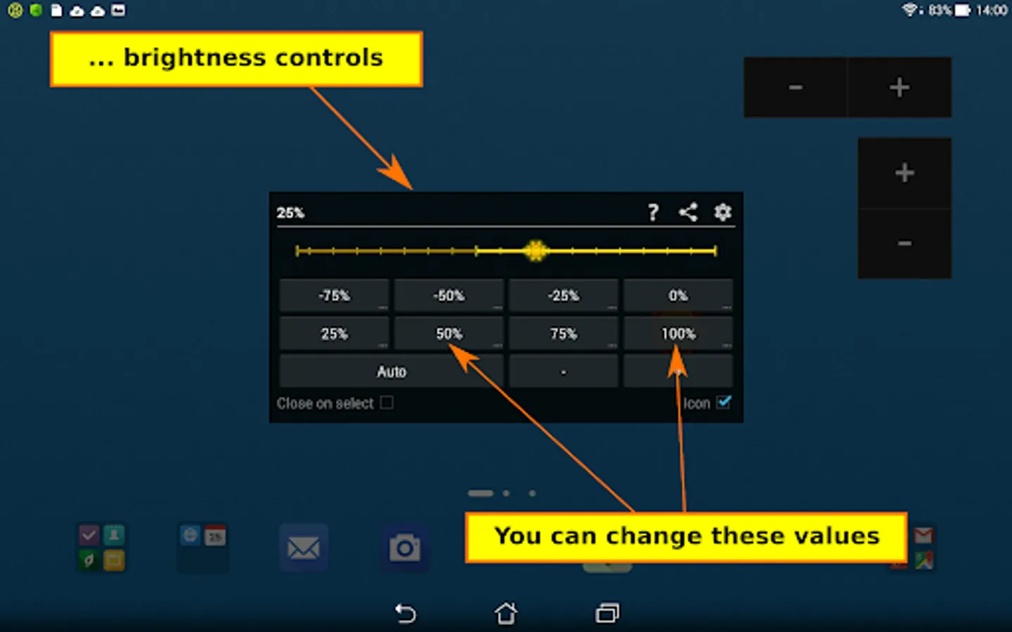 Note: It is not recommended to use multiple brightness control apps at the same time, because in this case brightness widget and brightness icon can show incorrect information.