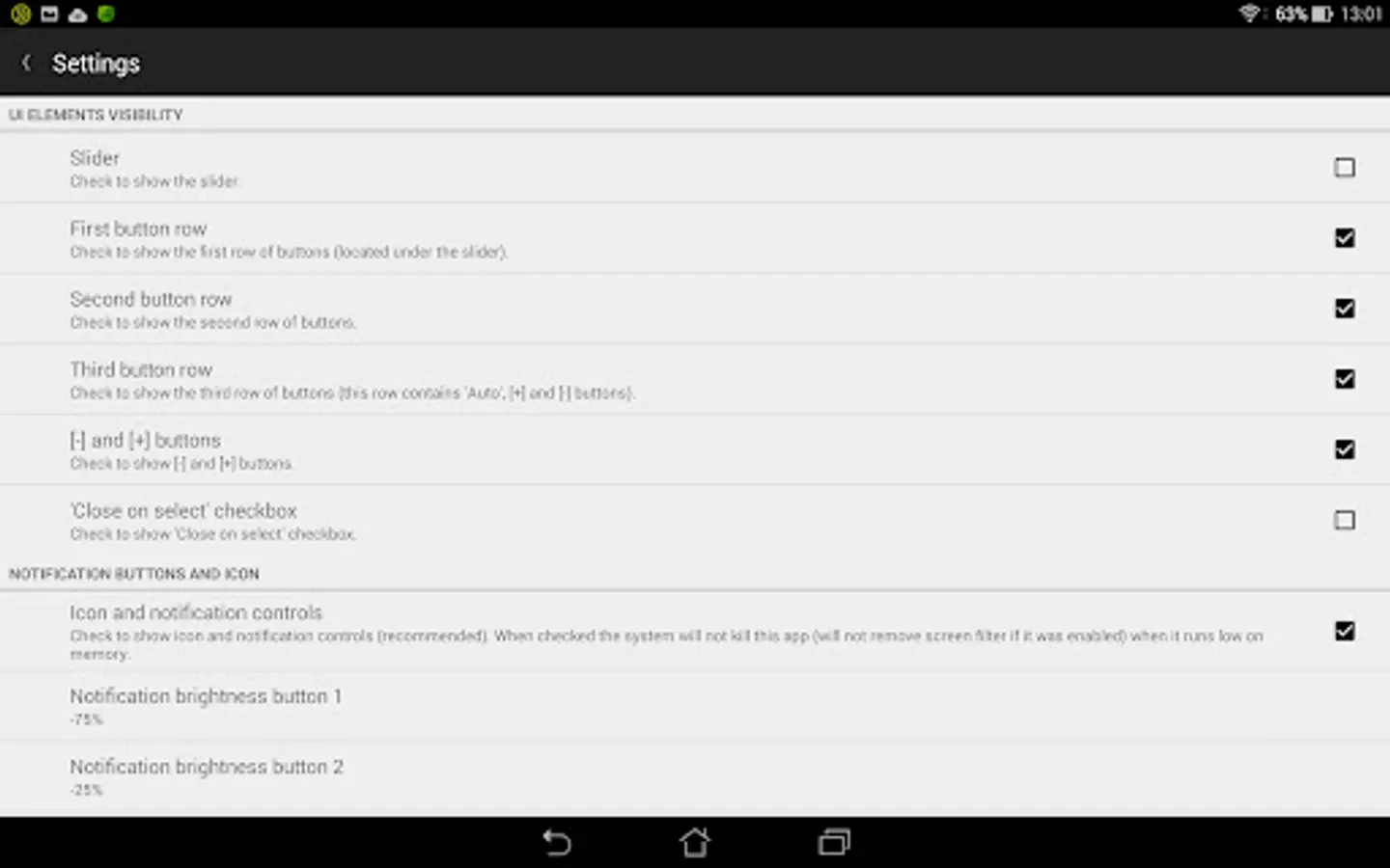 ● Dimmer / screen filter / night mode: you can reduce brightness to a lower value than the default settings allow (sub zero brightness levels, e.g. -50%, -60% etc.). The semi-transparent layer is drawn over your screen to reduce brightness below zero. It will protect your eyes in a dark environment.