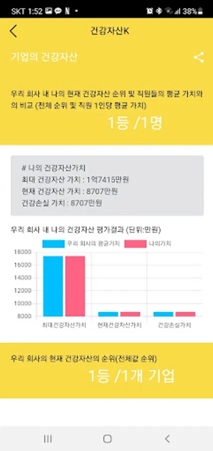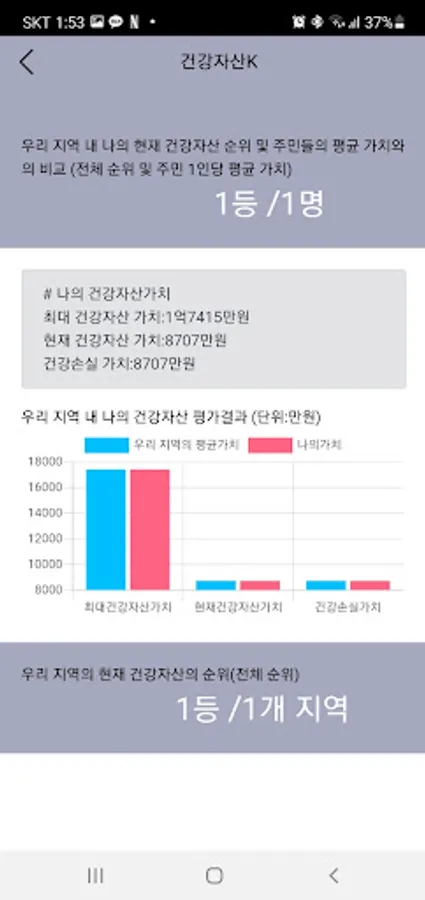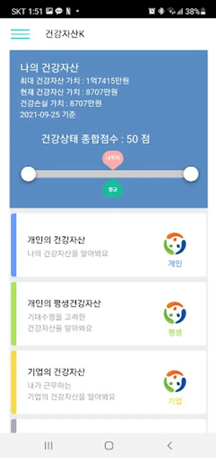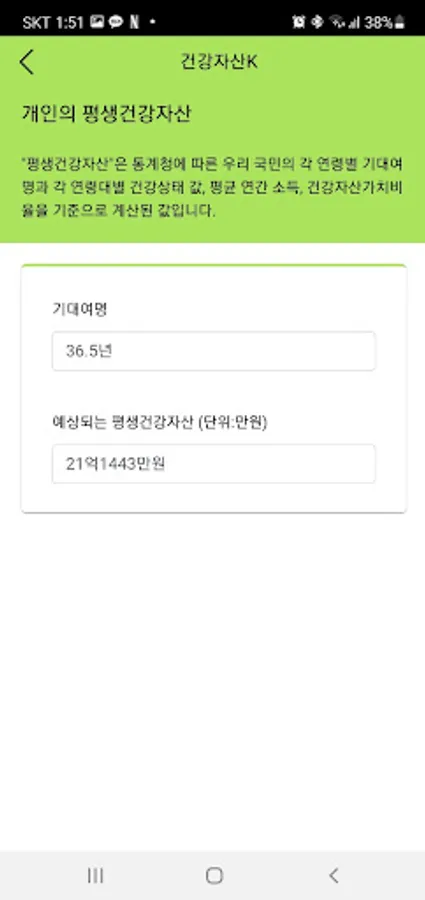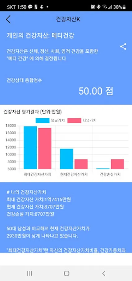 'Maximum health asset value' is based on the assumption that the state of health is the best, that is, assuming that physical, mental, social, spiritual, and general health are all the best health conditions, taking into account the user's annual income and health value ratio information. The value to be calculated. In other words, considering the value of the user's annual income and health loss, it means the maximum health asset value that the user can take.