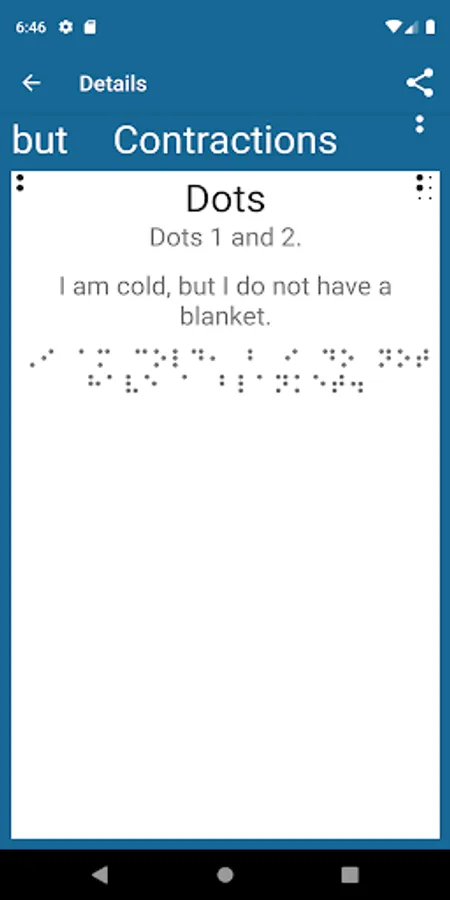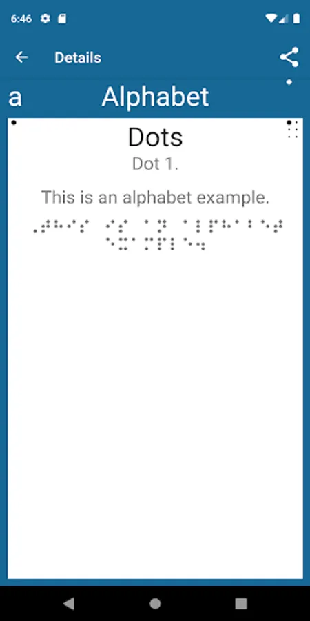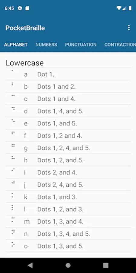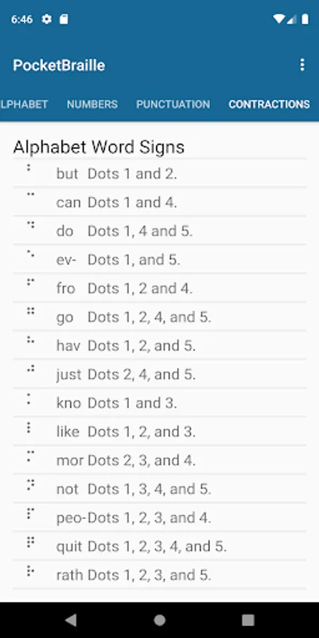 PocketBraille for Android lets users learn different Braille symbols including the alphabet numbers, punctuation, and all contraction characters. Users can also use a Braille display with Talkback and BrailleBack to feel the symbols that are spoken and displayed on the phone's screen.