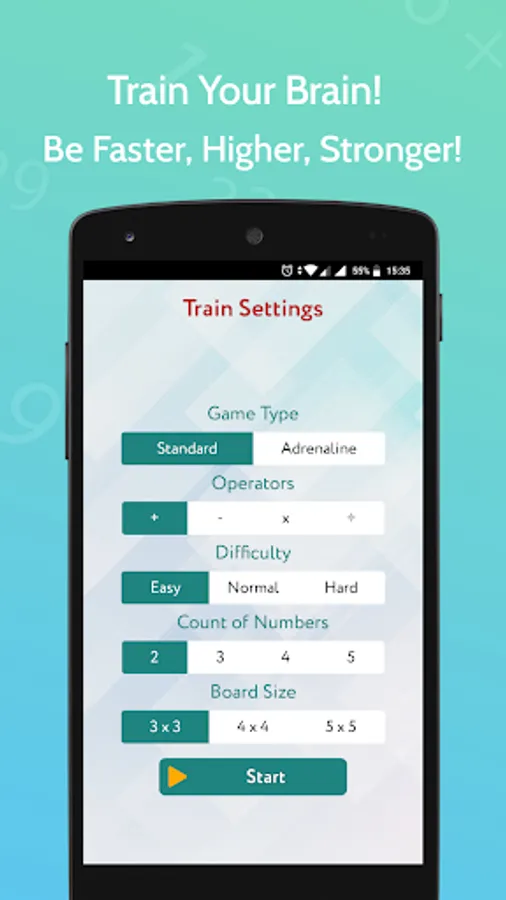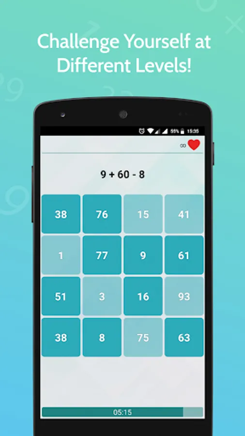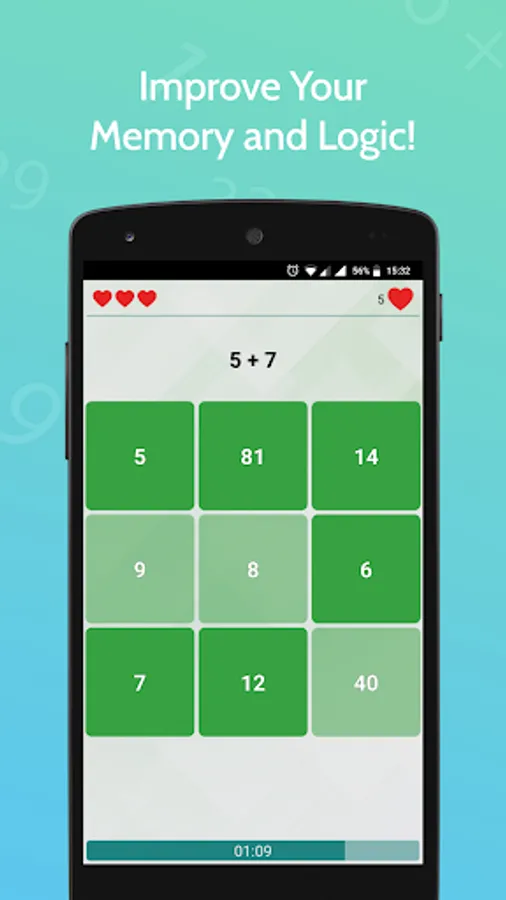 In the game, you improve your mental skills by passing different levels of difficulty. Each level improves your attention on math. You need to find the right number as fast as possible. Try to concentrate and do calculation in your brain.
