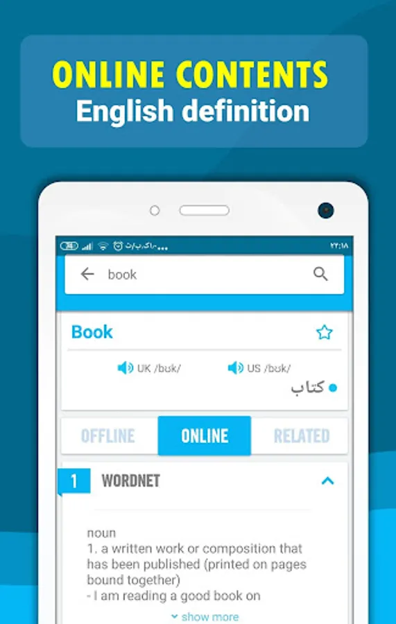 A. General section: in this section, Common meaning or translate of word showed. user see British and American phonetics and can listen British pronunciations and American pronunciation of word By pressing speakers, pronunciations of words in offline and online mode, for better word pronunciation need to connect to Internet. Last things exist in this sections is star, by touching it user can add word to favorite word list.