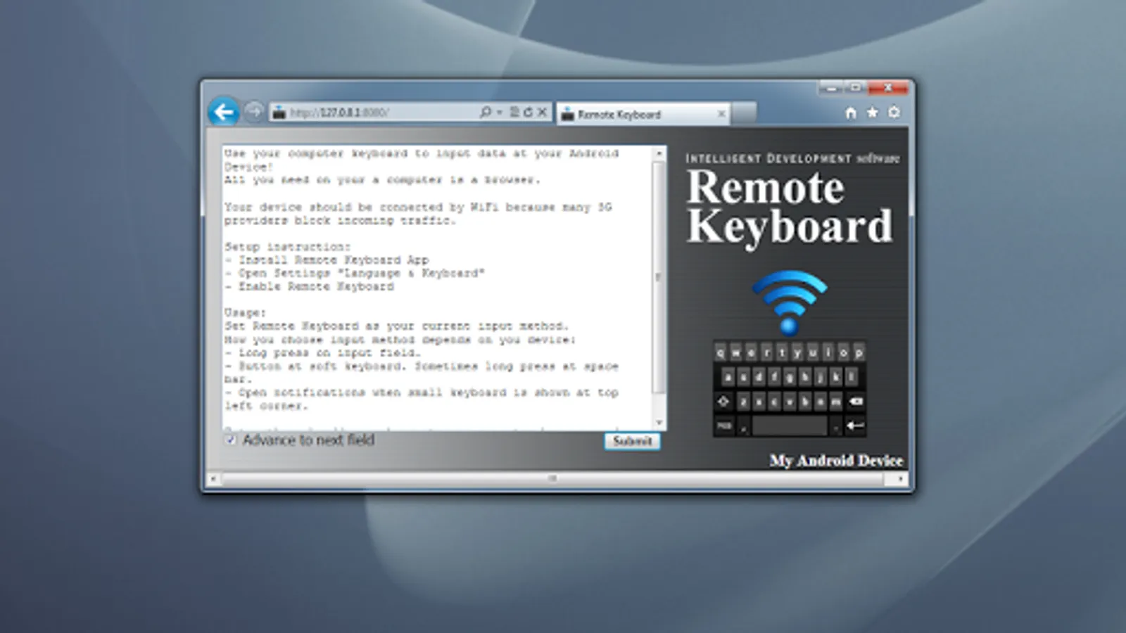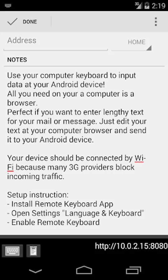 Perfect if you want to enter lengthy text for your mail or message. Just edit your text at your computer browser and send it to your Android device.