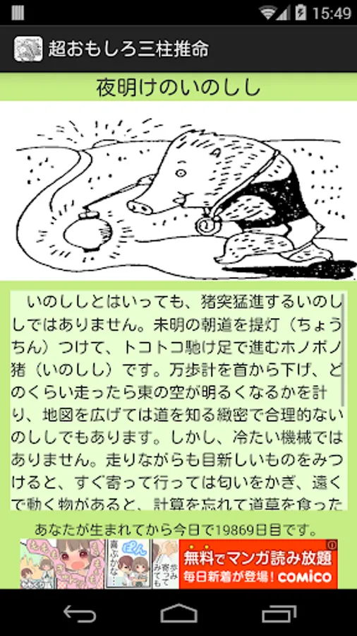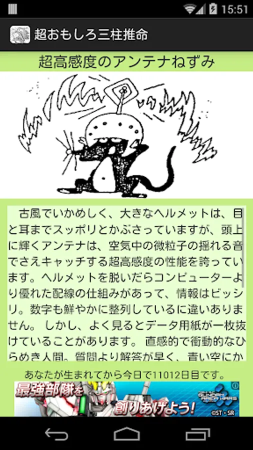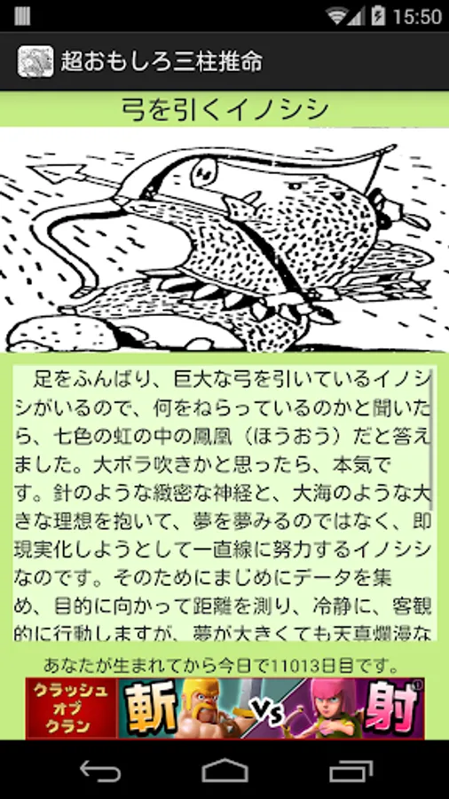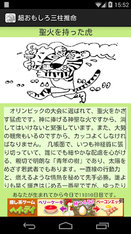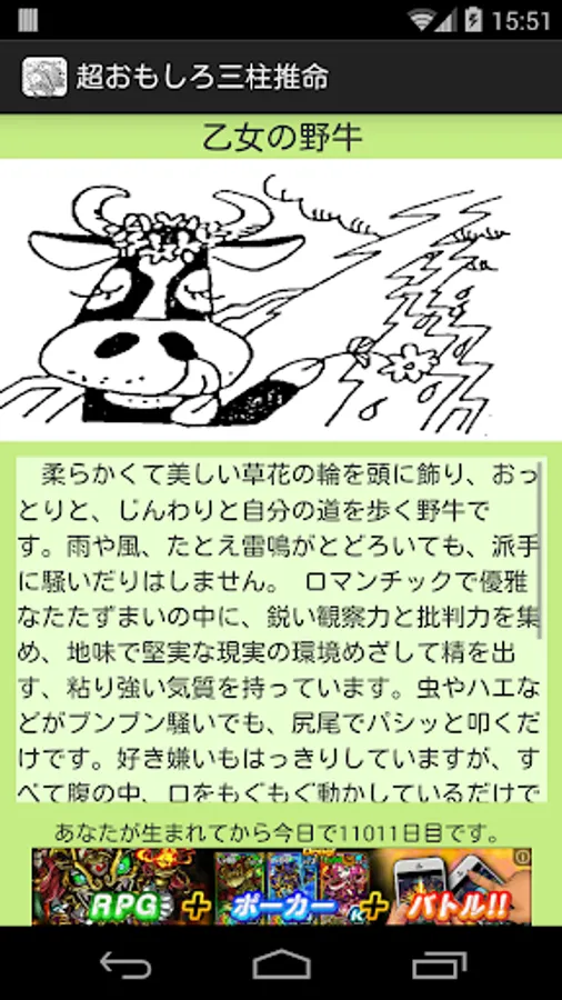 このアプリは元々Windows版「超おもしろ三柱推命」として2000年にリリース(Vector掲載中)したものをユーザーの皆様からのご要望を受け、Android版アプリとしてリリースをしたものです。 超おもしろ三柱推命は、生年月日から60通りの性格分類をするソフトです。当時、「厳選パソコン占い150(株式会社 千舷社)」などにも収録され、たくさんの反響をいただきました。生年月日から皆様の性格や特徴を動物にたとえて、おもしろおかしく性格分類を行います。性格分類は大変マトを得ていて面白いものになっているのではないかと思います。ストレス社会の現在、少しでも人間関係のストレスを解消し、人間理解を深め、少しでも円滑なコミュニケーションを実現するためのお手伝いができれば、との動機から開発を始めました。三柱推命という言葉は造語で実際にはありませんが生年月日のみ(誕生時間を除外)から判定を行っている点で三柱推命と名づけています。 まず、身近な家族、職場の上司・同僚、友人、これから生まれるお子様(予定日)、生まれたばかりの赤ちゃんなど色々な人を鑑定してみてください。きっと、「超おもしろ三柱推命」の周りでは、きっと爆笑の渦が巻き起こることでしょう。