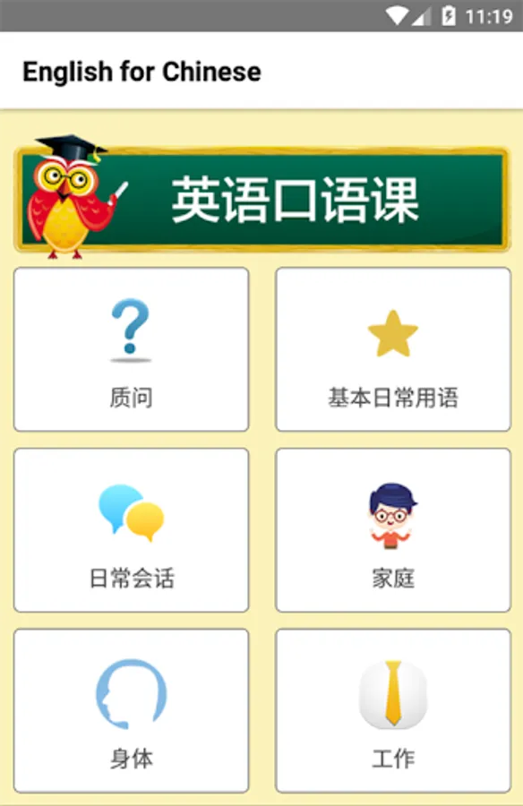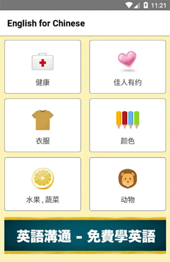 Question, basic everyday language, daily conversation, family, body, work, in restaurant, hotel and accommodation, shopping, travel, time, calendar, month, main, weather, health, beauty, clothes, color, fruit, vegetables ,