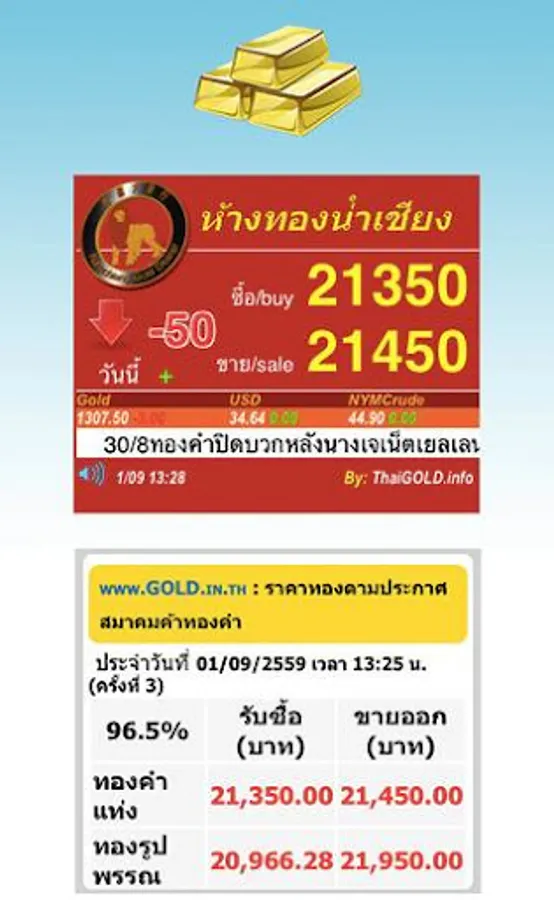 One Stop Service AFL full price of gold today. Gold prices, oil prices, PTT, Bangchak shares, stock indexes around the world. Foreign exchange rates Check parcel EMS Tracking lottery Check Lottery. Check today's weather and headlines.