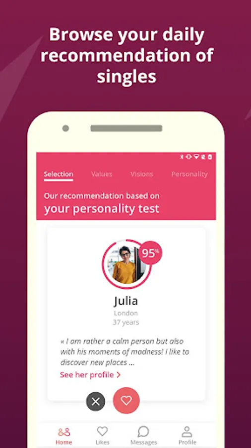Our main goal, is to help you to match with a compatible partner in order to begin a serious relationship with the guidance of our personality test. Thanks to our unique matchmaking algorithm based on 71 criteria’s, you will find the best profiles that match you. Whether its shared values, hobbies, plans or simply going through life at the same pace, these are all vital qualities that help light that initial spark and consolidate the relationship over time.