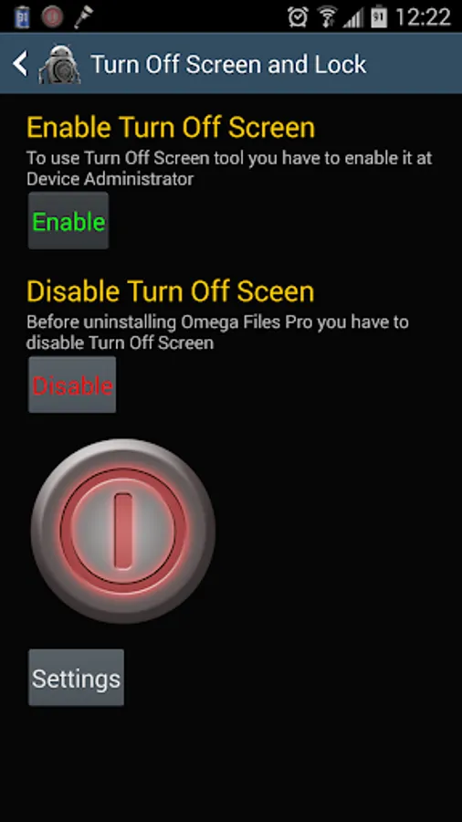 Turn Off Screen and Lock with App drawer shortcut and Widget, for this tool Omega Files pro uses the Device Administrator permission.