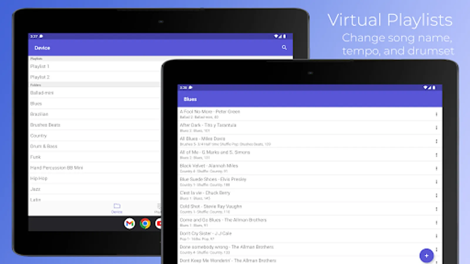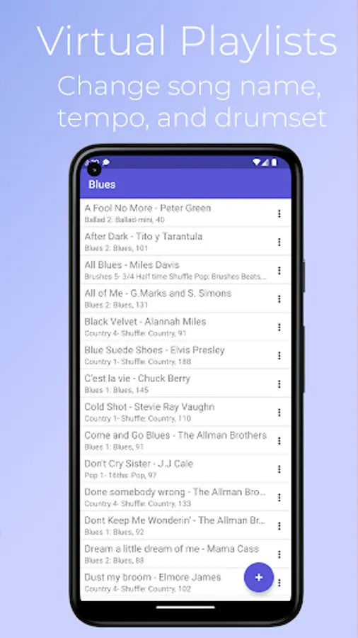 Create virtual playlists on your mobile without having to update your BeatBuddy project. Playlists contain virtual songs that link to existing songs but with their own name, drumset, and tempo.