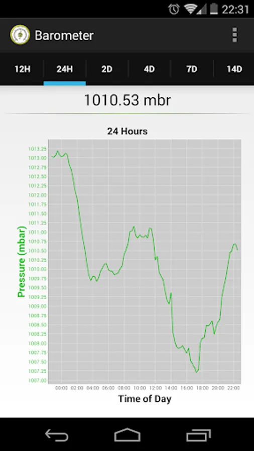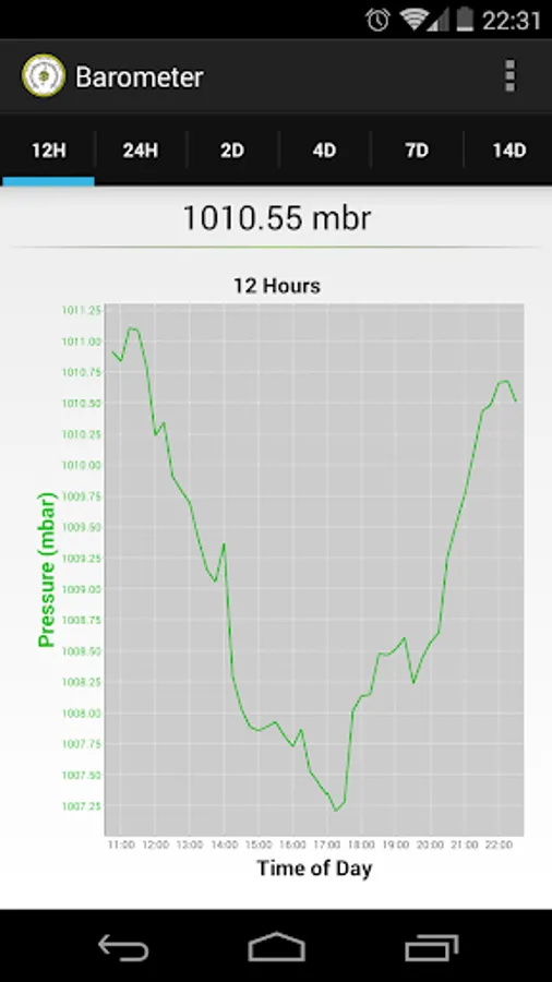 - Recorded pressure trend is presented in multiple charts (12 hours, 24 hours, 2 days, 4 days, 7 days, and 14 days)
