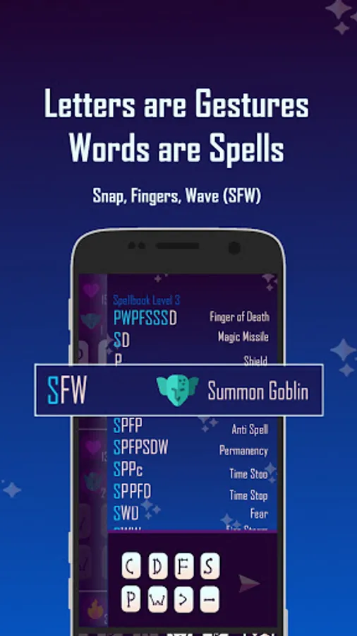 Warlock spells are text words, where each word like 'SFW' (Summon Goblin) is a magic spell, and each letter marks a hand gesture ('S' for snap fingers).