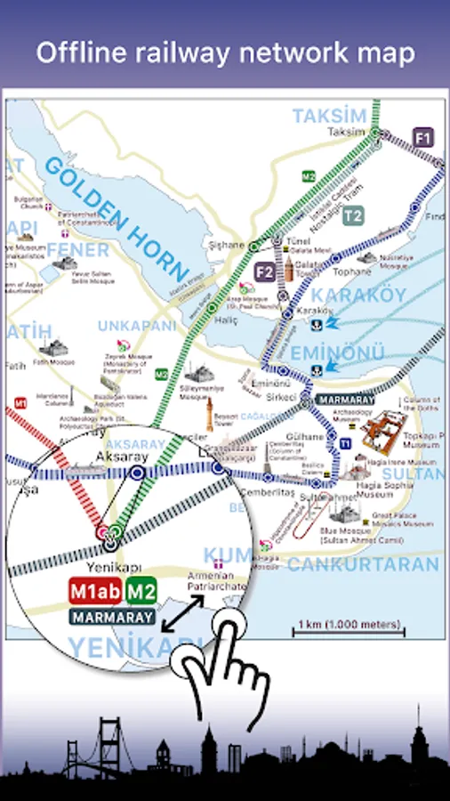 3- A realistic, offline and hand-drawn railway network map of Istanbul that indicates historical and touristic places.