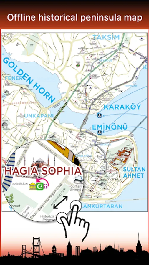 1- A hand-drawn and offline map of the historical peninsula of İstanbul that contains historical and touristic places such as Topkapı Palace, Hagia Sophia, Hippodrome, Sultanahmet, Grand Bazaar, and Eminönü.