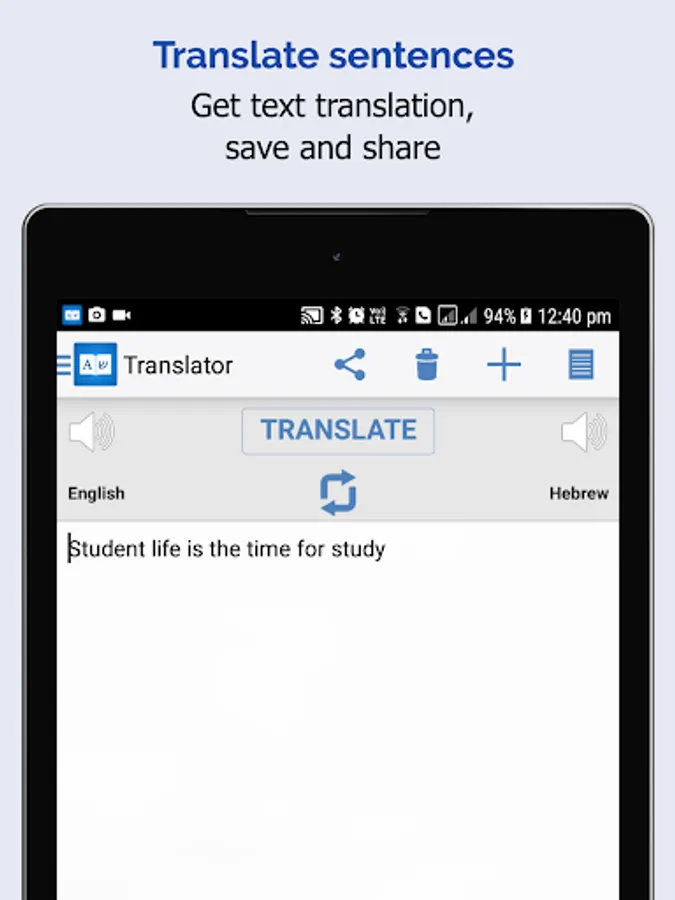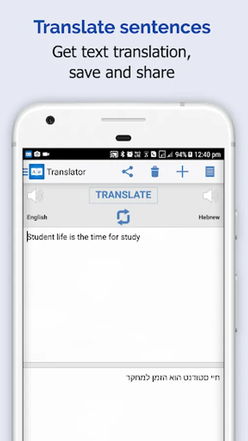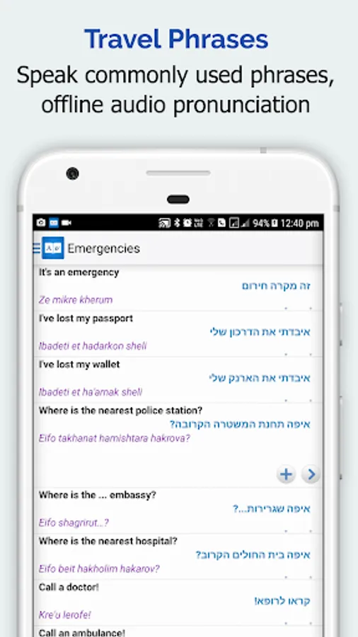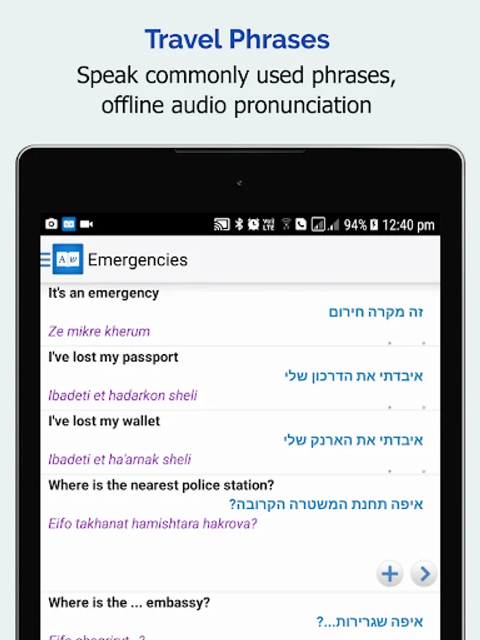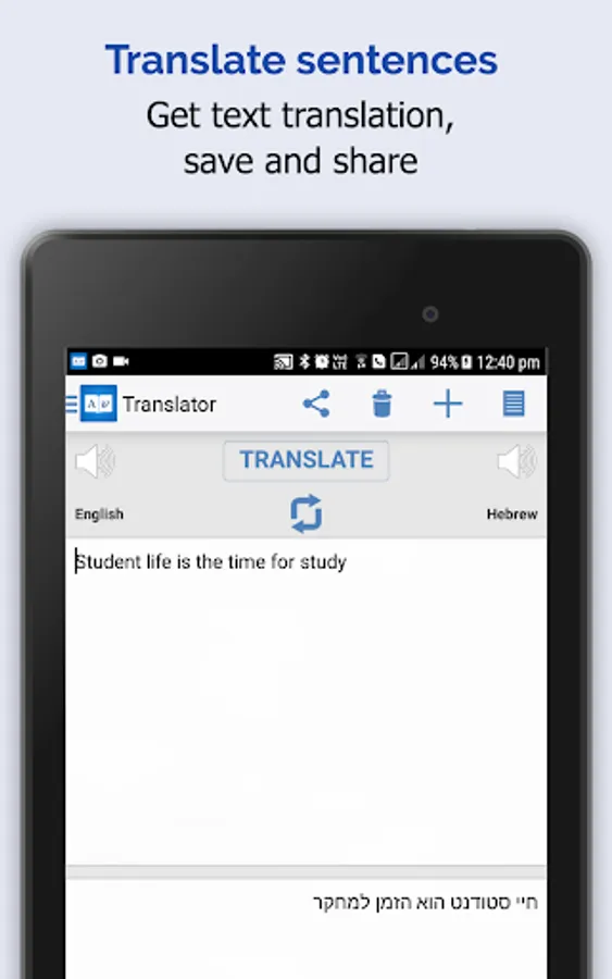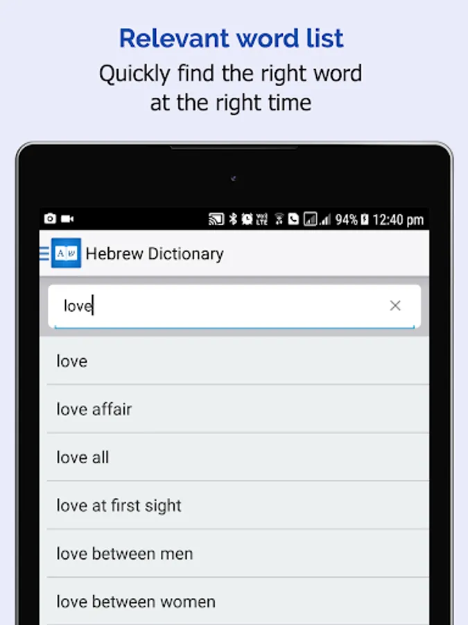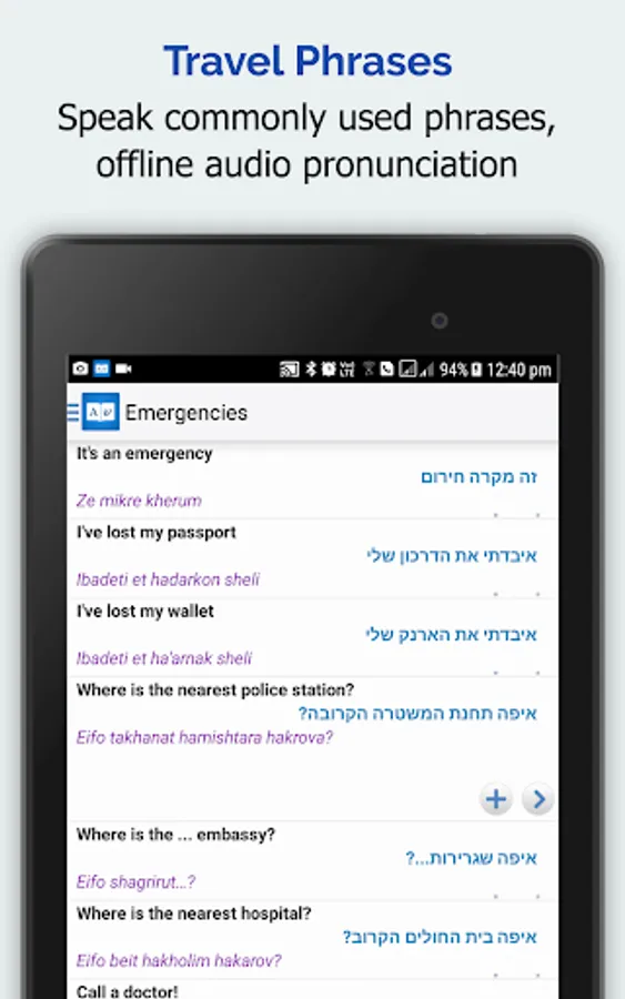 It is very easy to translate English to Hebrew or Hebrew to English with this Bilingual Dictionary. You will find the correct way to pronounce any word or phrase. It is perfect for teachers and students who want to learn English or Hebrew. You will also find synonyms and antonyms for each language. On-line & Of-line Mode dictionary