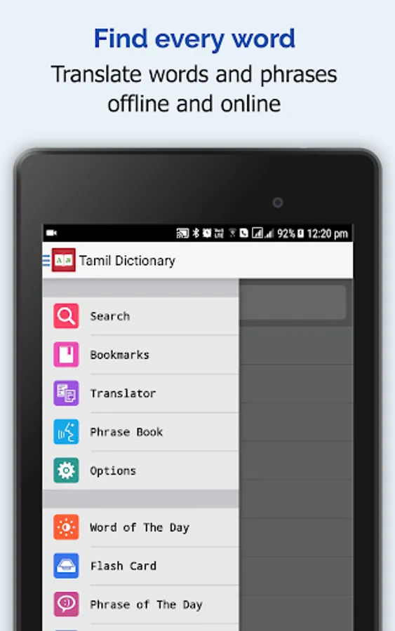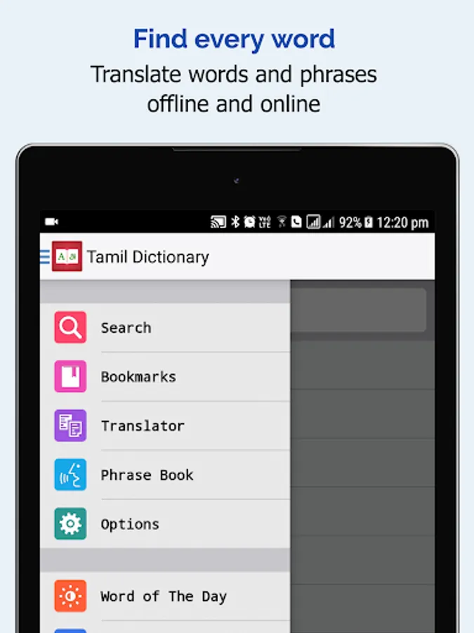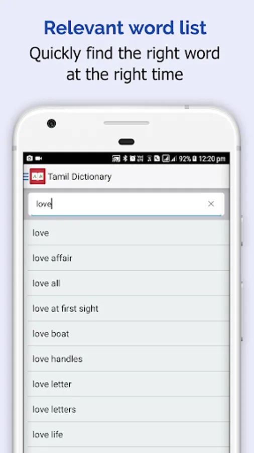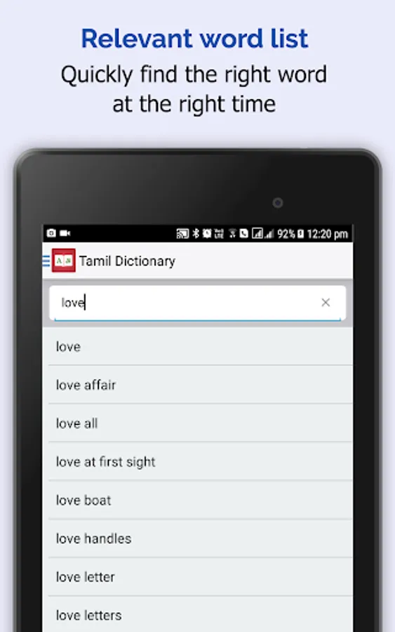 Find the correct meaning of all the English words, Tamil Dictionary is very simple to use, and the interface is design for you to fins exactly the term you are looking for. Find deeper meaning to sentences, words, phrases, common sayings and more.