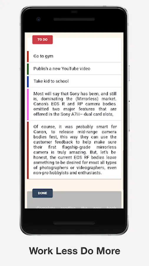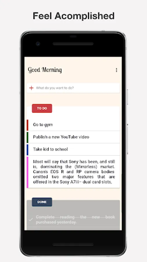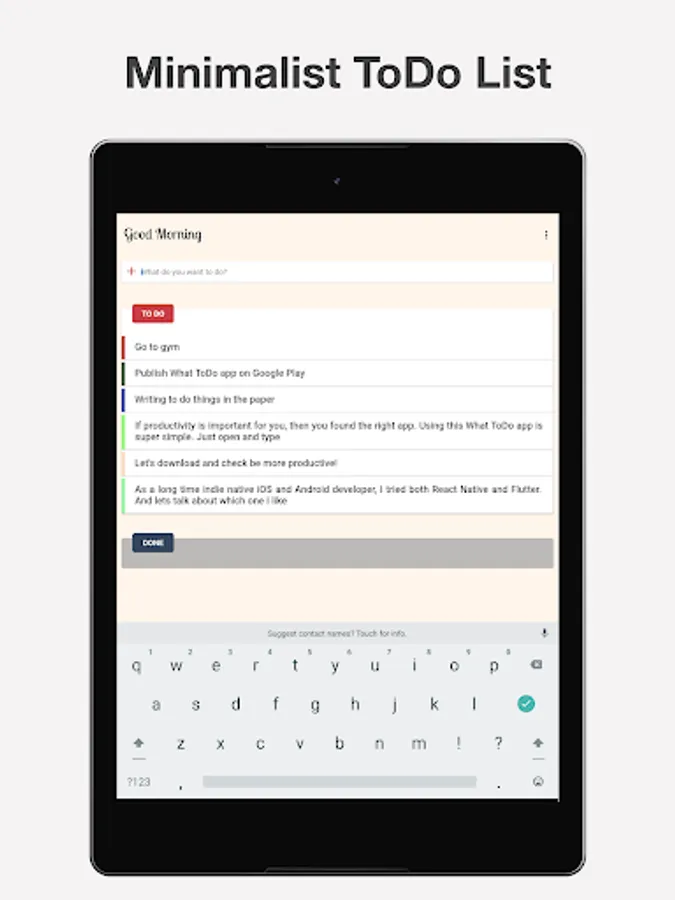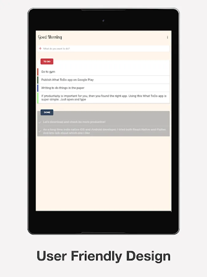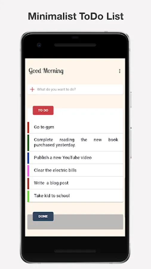 What ToDo is a Task Management application. It is developed using the concept of getting things done. This app is for those who love the minimalist approach.