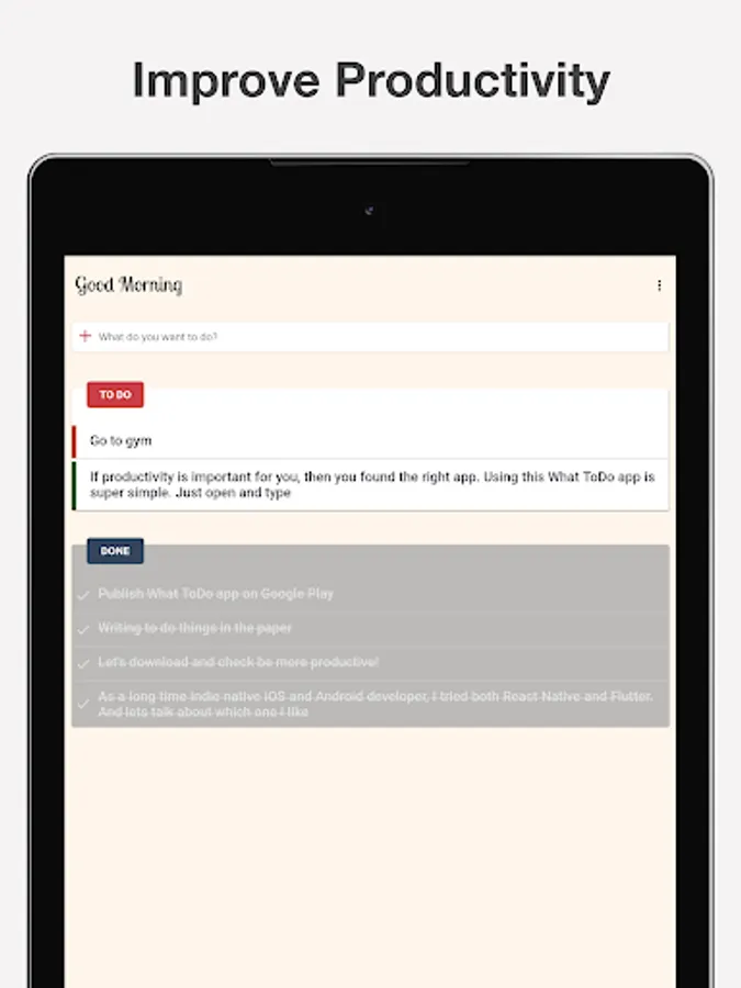 If productivity is important for you, then you found the right app. Using this What ToDo app is super simple. Just open and type.