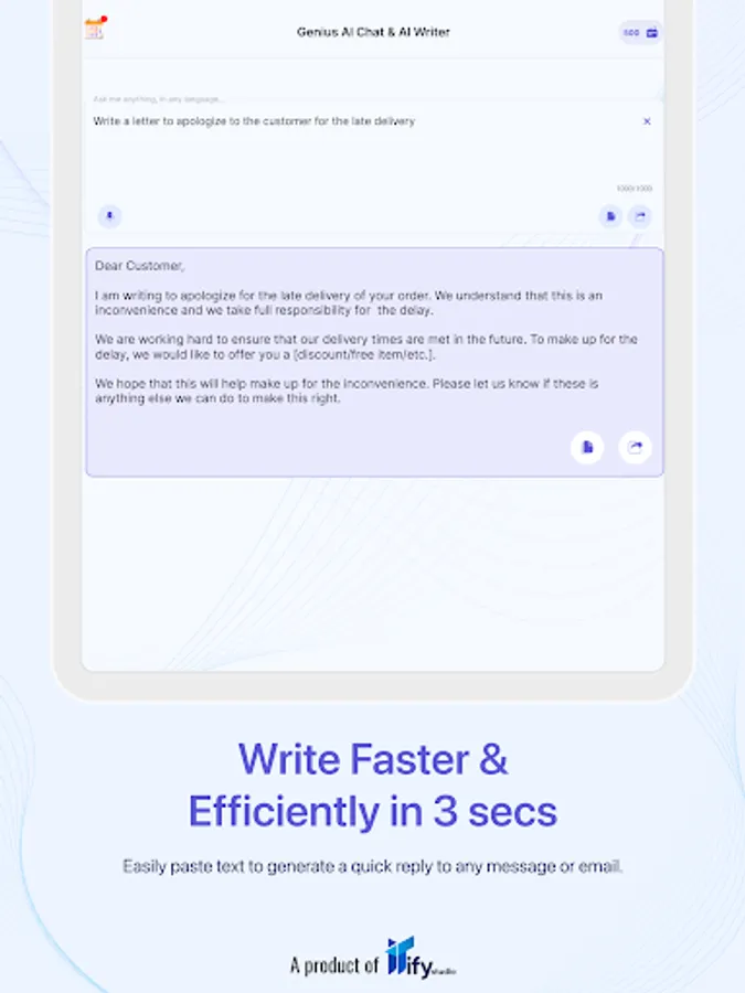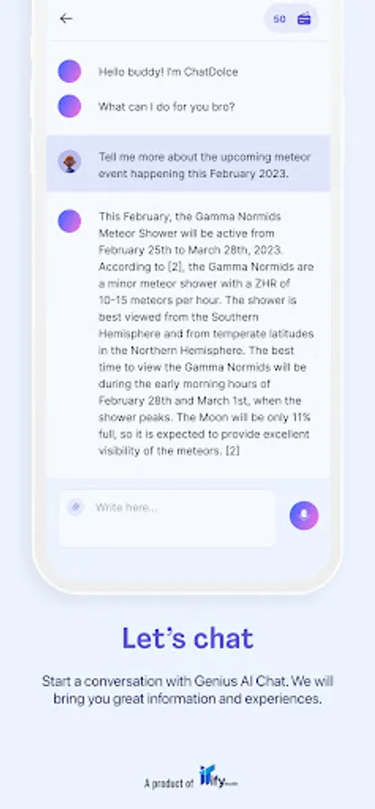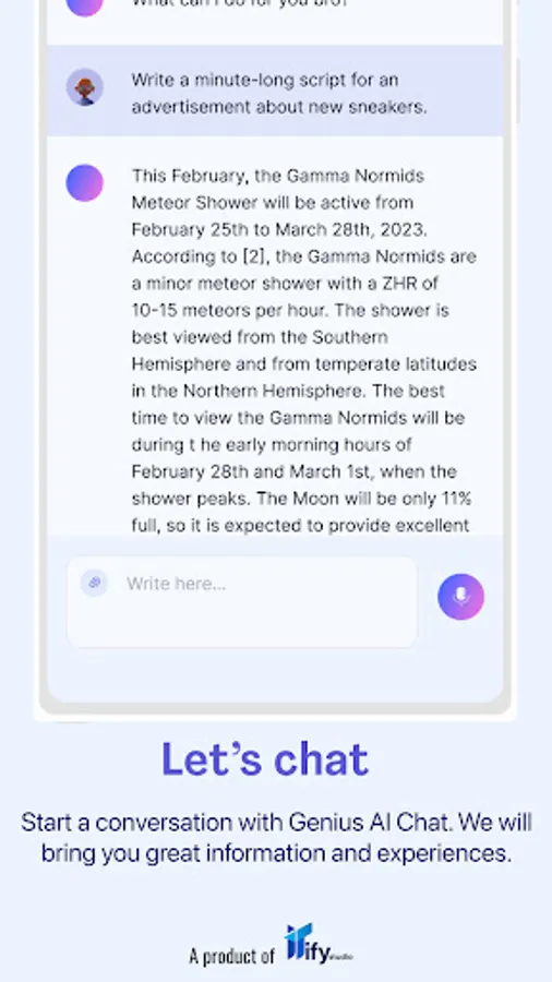 Chat AI is an exceptional multilingual writing and knowledge assistant for students and professionals. Itify's Chat AI is guaranteed to increase your productivity and writing quality. Write articles quickly, respond to communications, and maintain professional language and tone. You may ask it anything and save time on time-consuming tasks by doing so. Welcome to the limitless possibilities of human-AI collaboration.