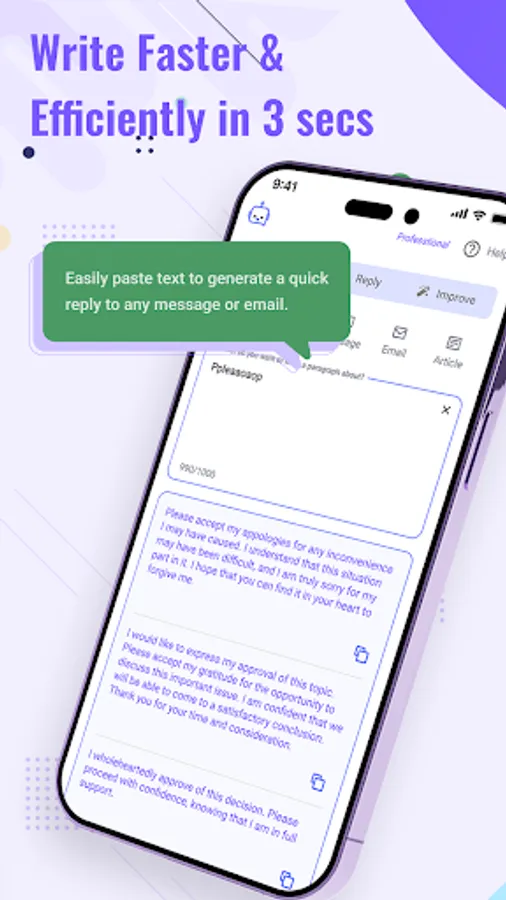 *REPLY* to emails and texts in an instant. Copy and paste any email or remark to get an instant response in your preferred tone - simply indicate approval or disapproval. Leave email response to the AI to save time.