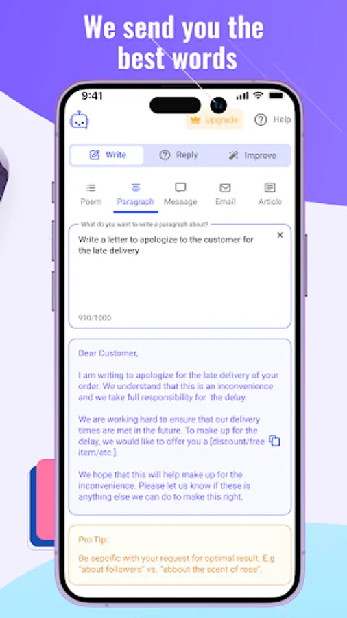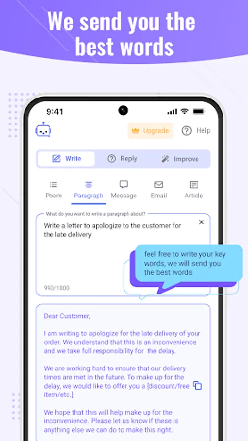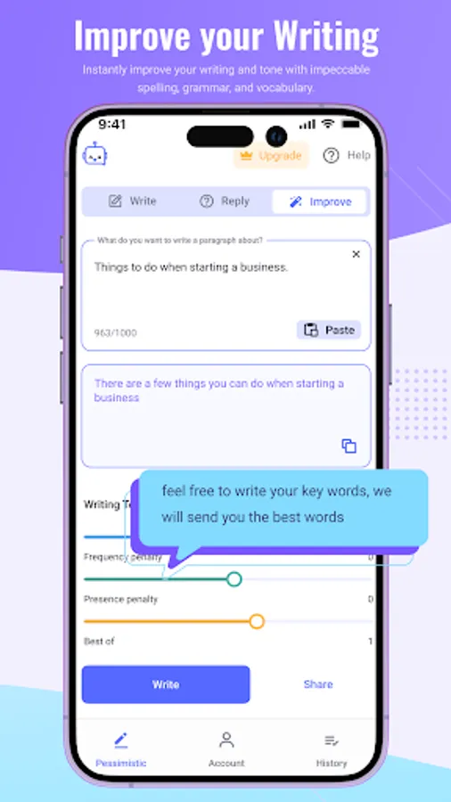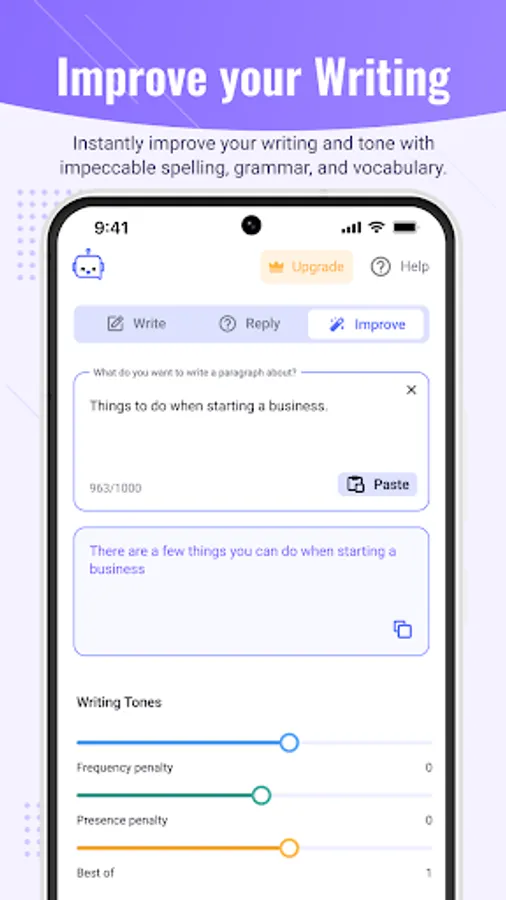 *IMPROVE* the grammar and tone of any text. Chat AI will use expert spelling, grammar, and terminology to improve or rewrite preliminary writings and outlines. Interpret the tone of your work to verify that you are expressing your intended message.