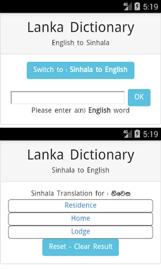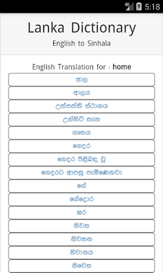Lanka Dictionary is Sinhala to English and English to Sinhala Dictionary. The dictionary contains about 245000 Sinhala-English terms.