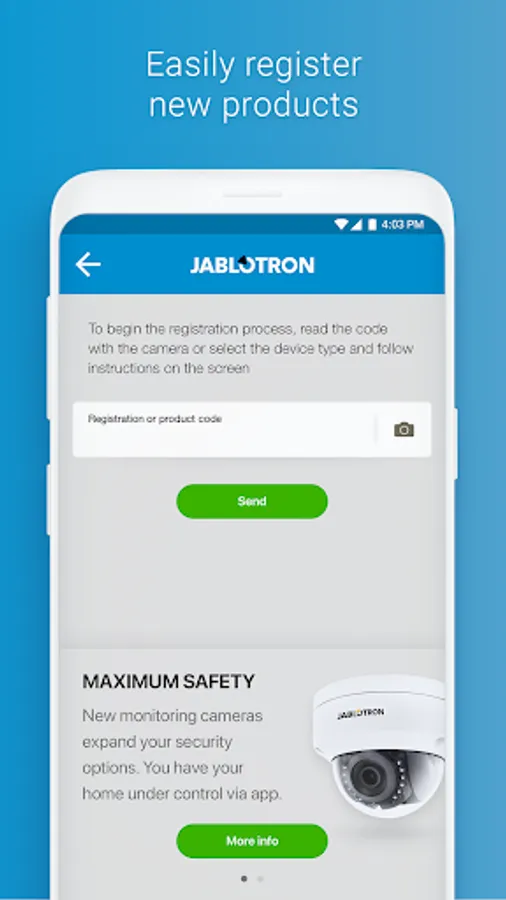 - Module for device registration to MyJABLOTRON: Simplification of the registration of supported devices to MyJABLOTRON by scanning the REG-KEY or the serial number with your mobile phone camera and entering a minimal amount of required information,