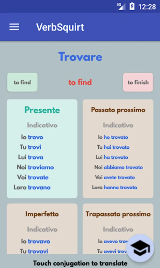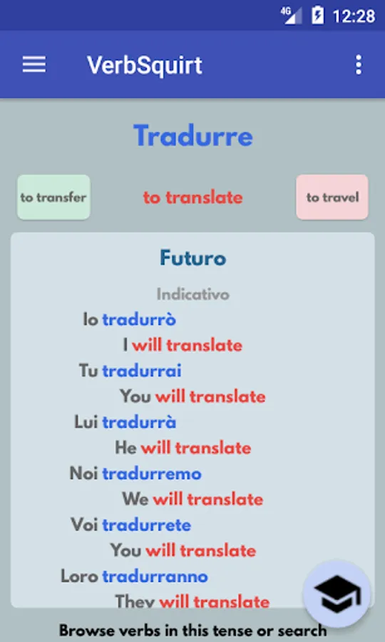 Once fluency improves, VerbSquirt helps the user gain familiarity with the different rules of conjugation for Italian verbs, and with the exceptions, leading to a better understanding of the subtleties of the language.
