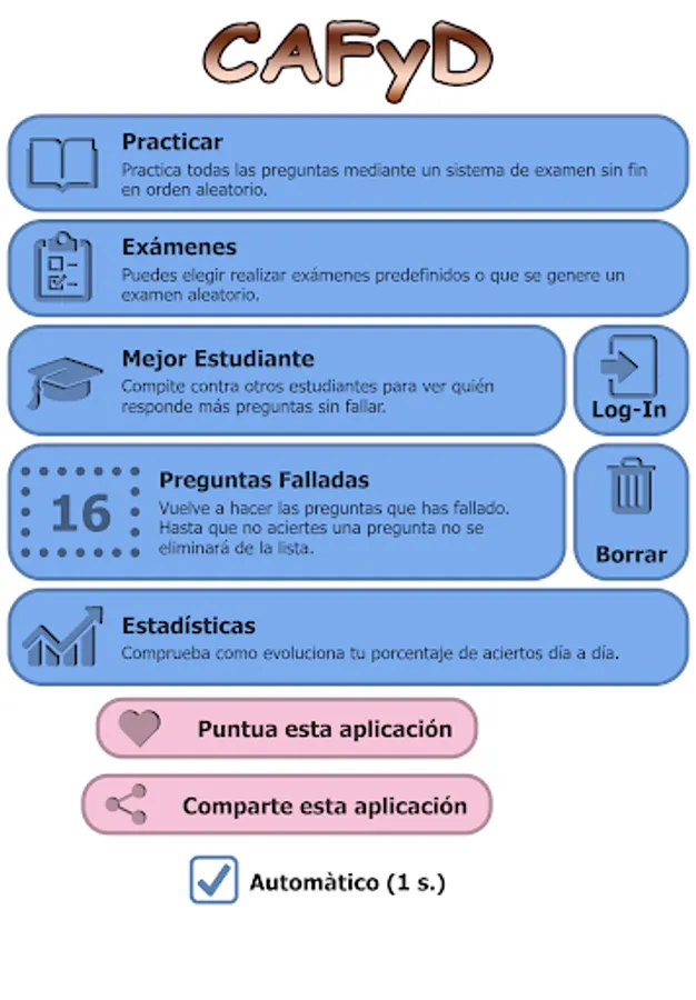 CAFyD is a mobile application designed specifically for university students of Physical Activity and Sports Sciences. This app will help you prepare for your multiple choice exams, reviewing and evaluating your knowledge in the various subject areas of the degree.