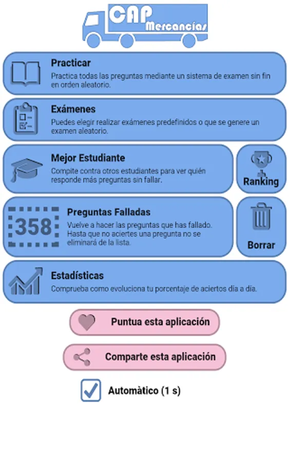 This application is not related to the DGT or the Ministry of Transport, we only use the official questionnaire created by them, which is available to everyone at the following address: https://www.mitma.gob.es/areas- of-activity/land-transport/services-to-the-carrier/cap/exams-for-training-of-professional-drivers-cap