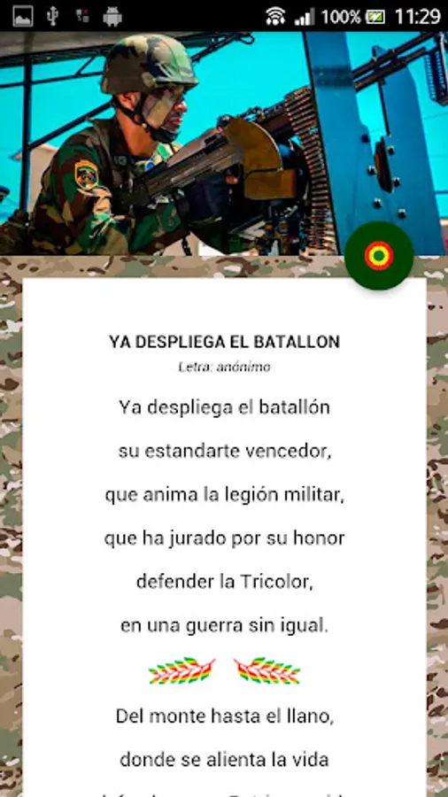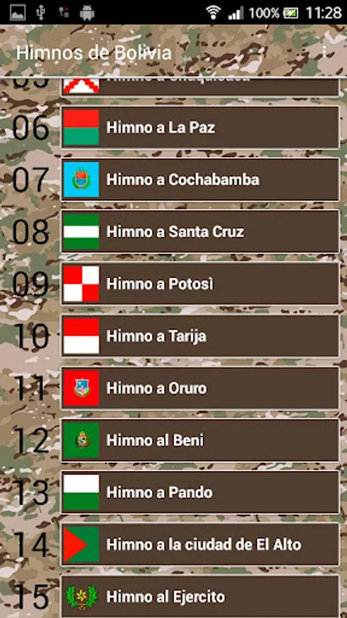 In this first version it comes with 20 Hymns and Marches all Bolivian who made his military service knows that all new and pre-military soldier must know.