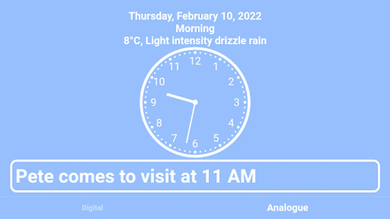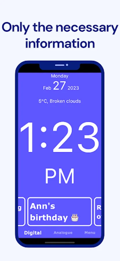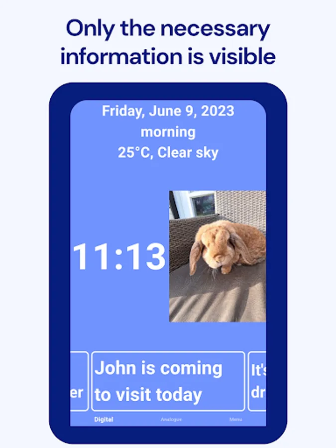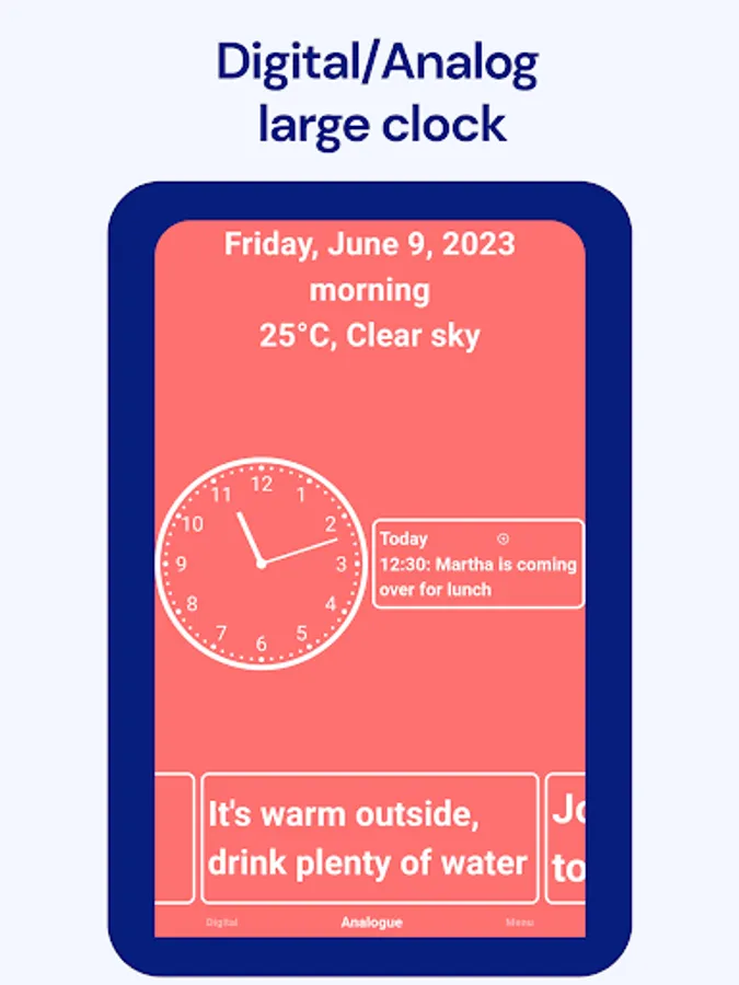 Empower yourself or your loved ones with Calendar Clock, the indispensable app designed to cater specifically to the needs of the elderly, individuals with dementia, and those affected by Alzheimer's. This comprehensive tool combines a clock, agenda, reminders, and personal messages to provide a seamless and supportive experience for individuals facing memory impairment or a reduced sense of time.