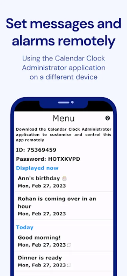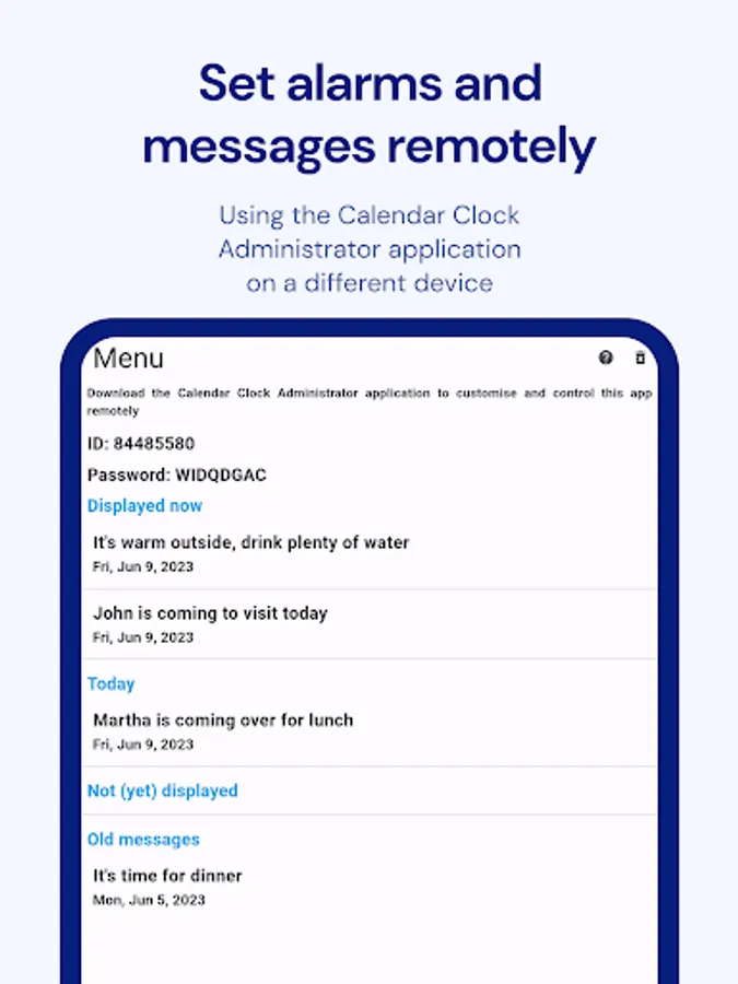 - Administrator Connectivity: Enhance functionality by linking Calendar Clock with the dedicated "Calendar Clock Administrator" app. Caretakers, professionals, relatives, or friends can remotely schedule, edit, and delete messages and reminders, ensuring seamless coordination.