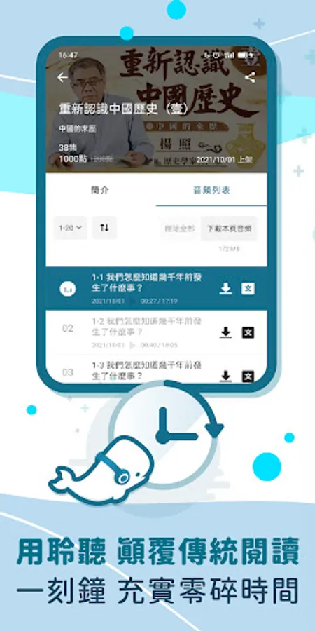 In a moment of whale selection, good knowledge is in your ears. Listen for 15 minutes, open the door of knowledge and lead to a quality life. More than 300 packs of in-depth knowledge in various fields: literature, history and philosophy, music and painting art, spiritual healing and other in-depth knowledge are available for you to choose and listen to. Lecturers in various fields are professional leaders, provide wonderful knowledge content, explain the profound things in simple language, and inspire you every minute. Take advantage of fragmented time, not limited by space, study painlessly, choose a whale at a moment, and accompany you all the time.