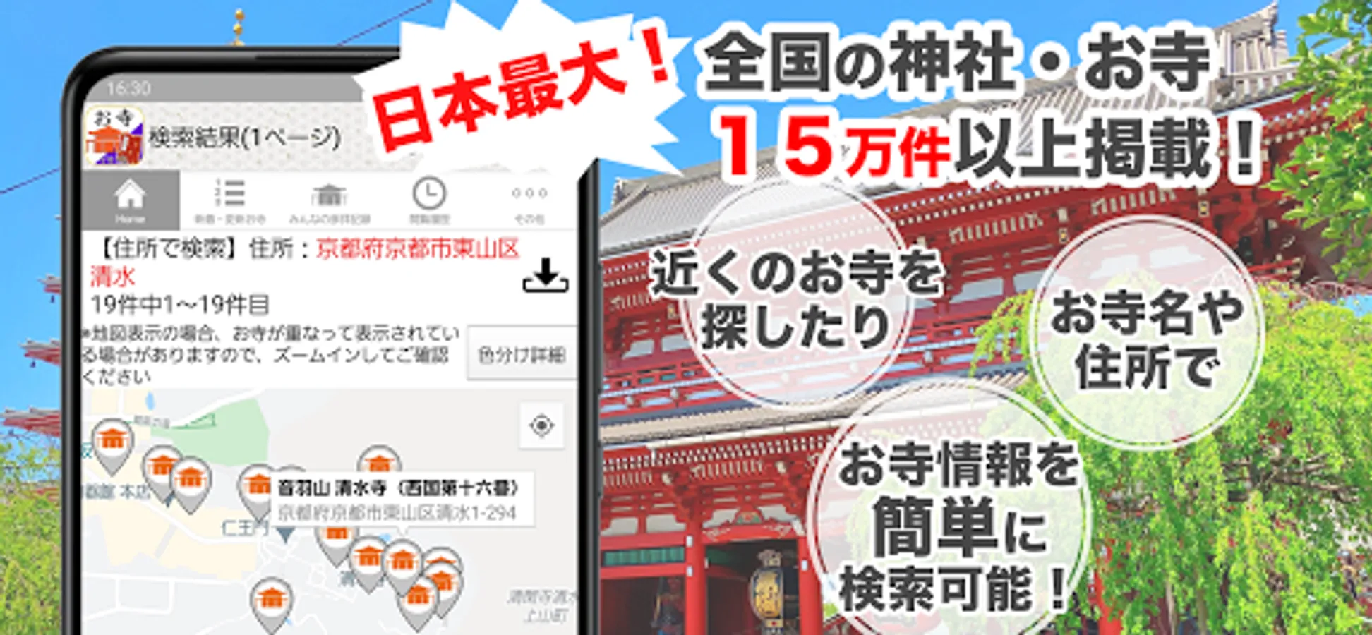 ・"Search by location" function that allows you to specify a location from the map or search for temples near famous buildings.
