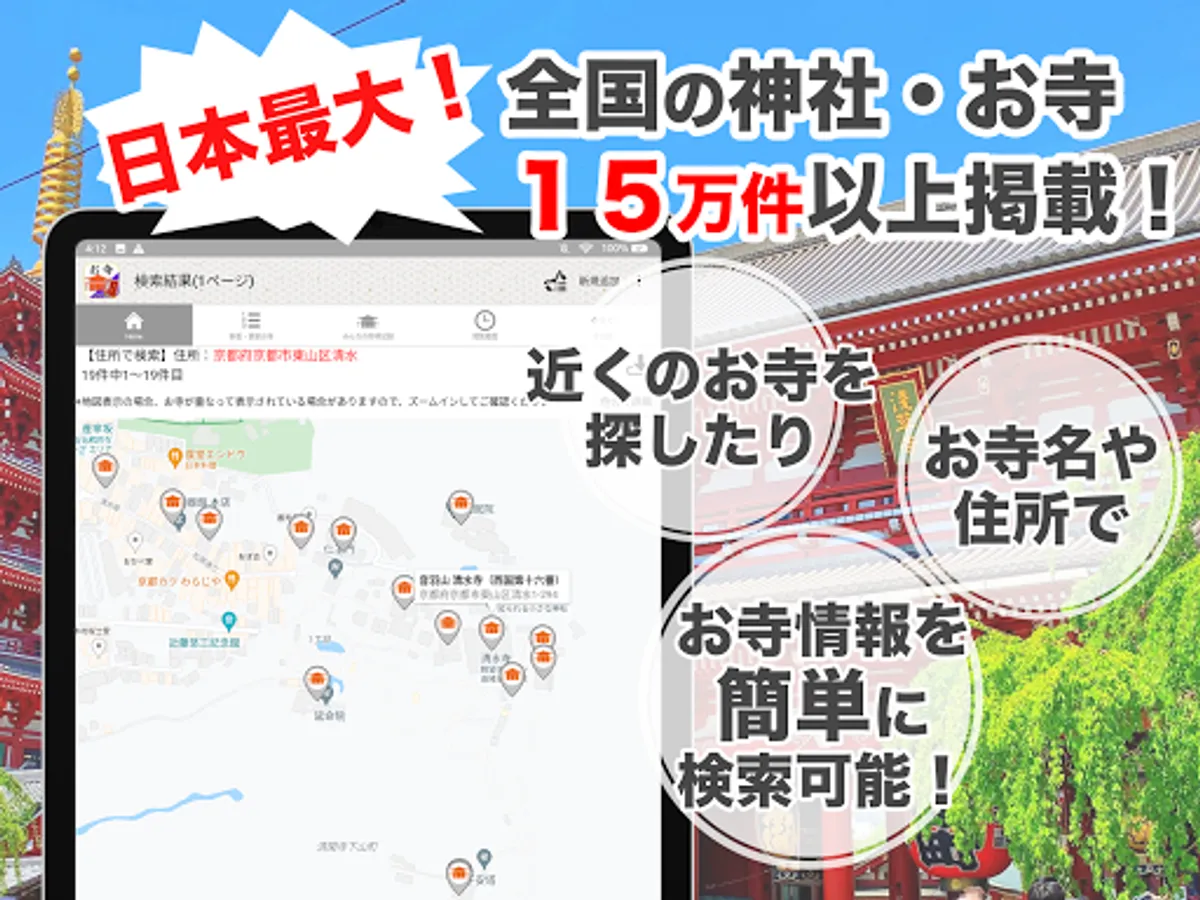 Free, easy one-touch search for over 150,000 temples and shrines!