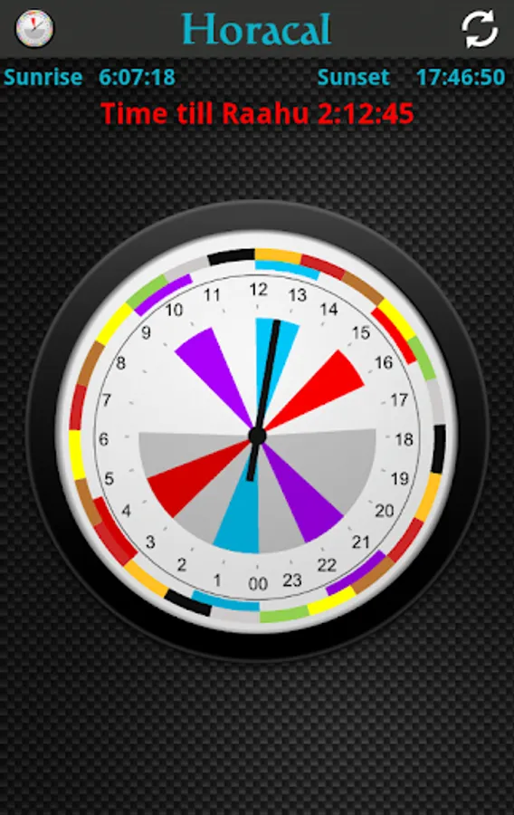 The Raahu period is clearly shown in a 24 hour clock face in red colour. Other hora times can be enabled as required.