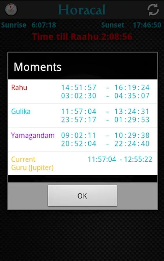 The app uses precise GPS location to determine the sunrise and the sunset in calculating the Raahu and Hora.