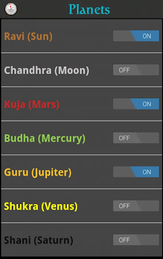 The app also enables the user to turn on/off other horas (Ravi - Sun, Chandra - Moon, Kuja - Mars, Guru - Jupiter, Shani - Saturn, Shukra - Venus, Budha - Mercury) during the day as required. Precise time of these horas can be access by sliding your finger down on the screen.