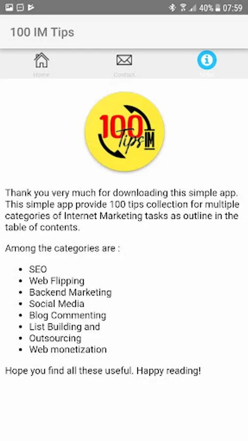 This app provide a simple guide/info for internet marketer to get some idea on what they're supposed to do in IM world in order to monetize and action required to take to expand their IM tasks.
