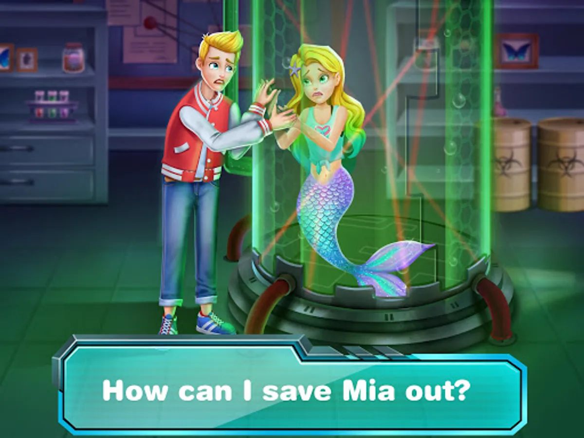 10.Gosh! Mermaid Mia is locked in a container. What will Eric do to save mermaids Mia out in mermaid girl games?