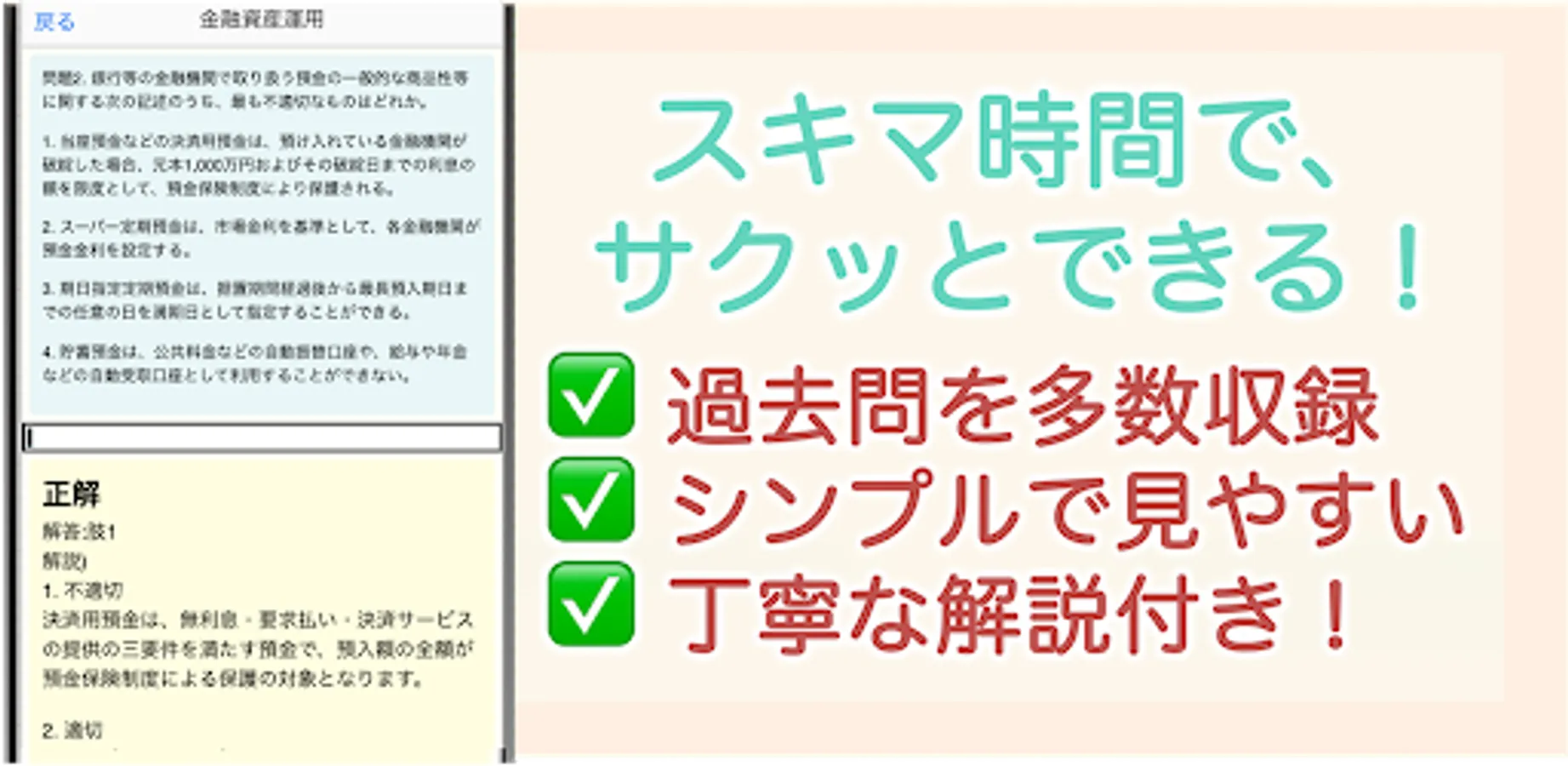 It is an FP2 level exam preparation app that allows you to solve past questions in your spare time and learn. Carefully selected questions that often appear in the exam.