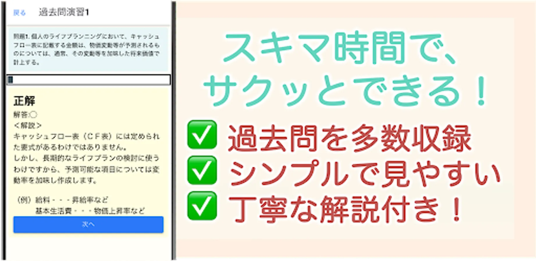 It is an FP3 level exam preparation app that allows you to solve past questions in your spare time and learn. Carefully selected questions that often appear in the exam.