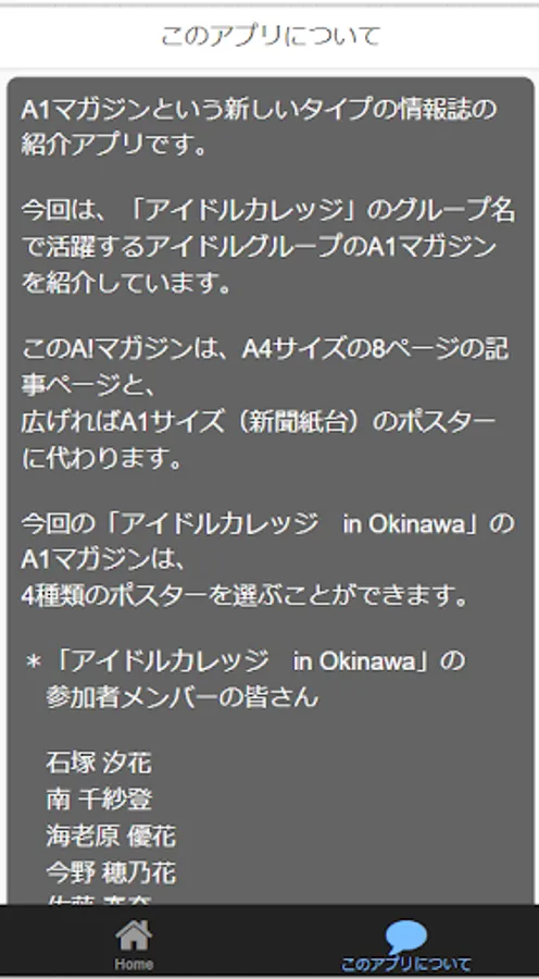 A1マガジンという新しいタイプの情報誌の紹介アプリです。今回は、「アイドルカレッジ」のグループ名で活躍するアイドルグループのA1マガジンを紹介しています。