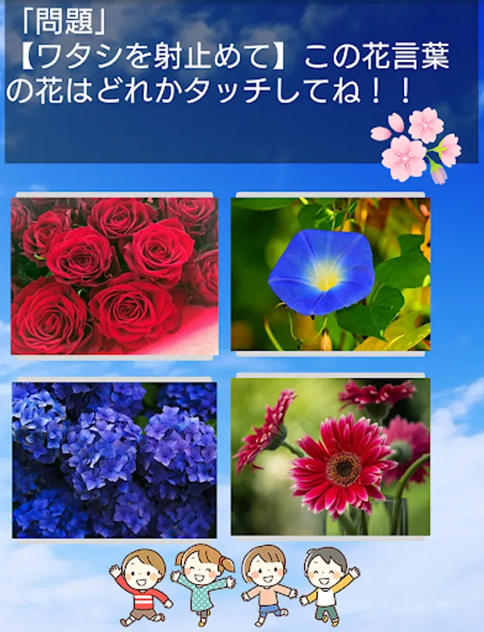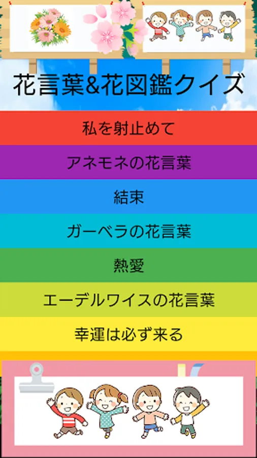 花言葉クイズアプリ。いろんな花の花言葉をクイズにして出題。答えには花の説明も書いてあるので図鑑や辞典としても使えるよ。暇つぶしに最適