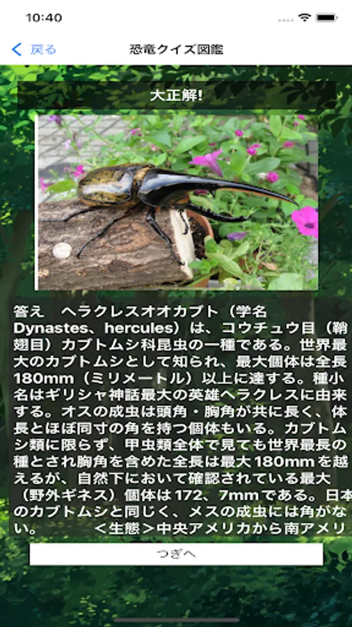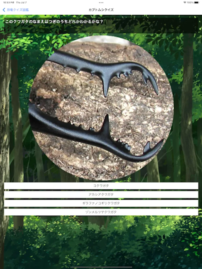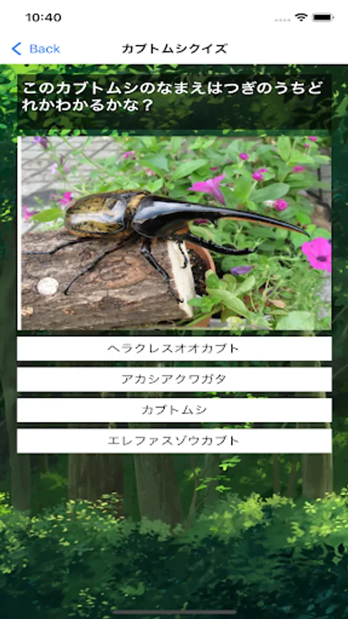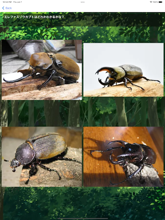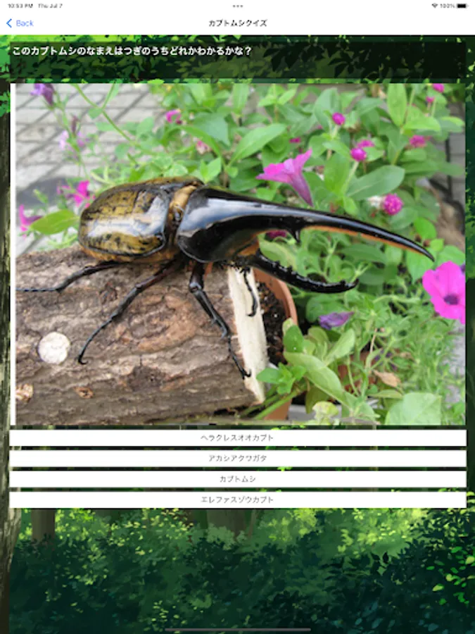 Rhinoceros beetle, stag beetle quiz app. This is a quiz about popular insects, beetles, and stag beetles using images. An app that can be enjoyed by children and adults alike.