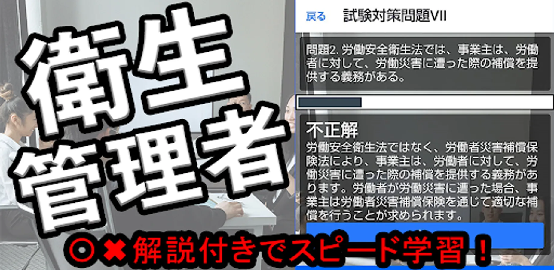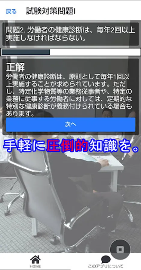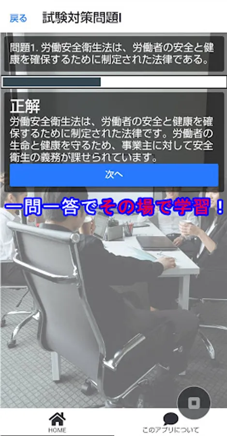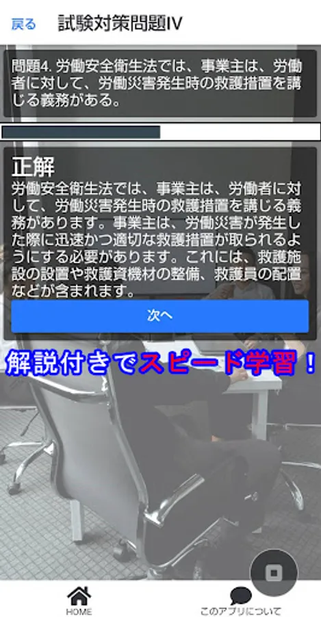 In this app, each problem has a correct answer explanation, so you can deepen your understanding. Covering the range of questions, you will learn a wide range of knowledge such as the Industrial Safety and Health Act, related laws and regulations, occupational hygiene, and environmental hygiene. You can expect more effective learning by linking it with past exam preparation.