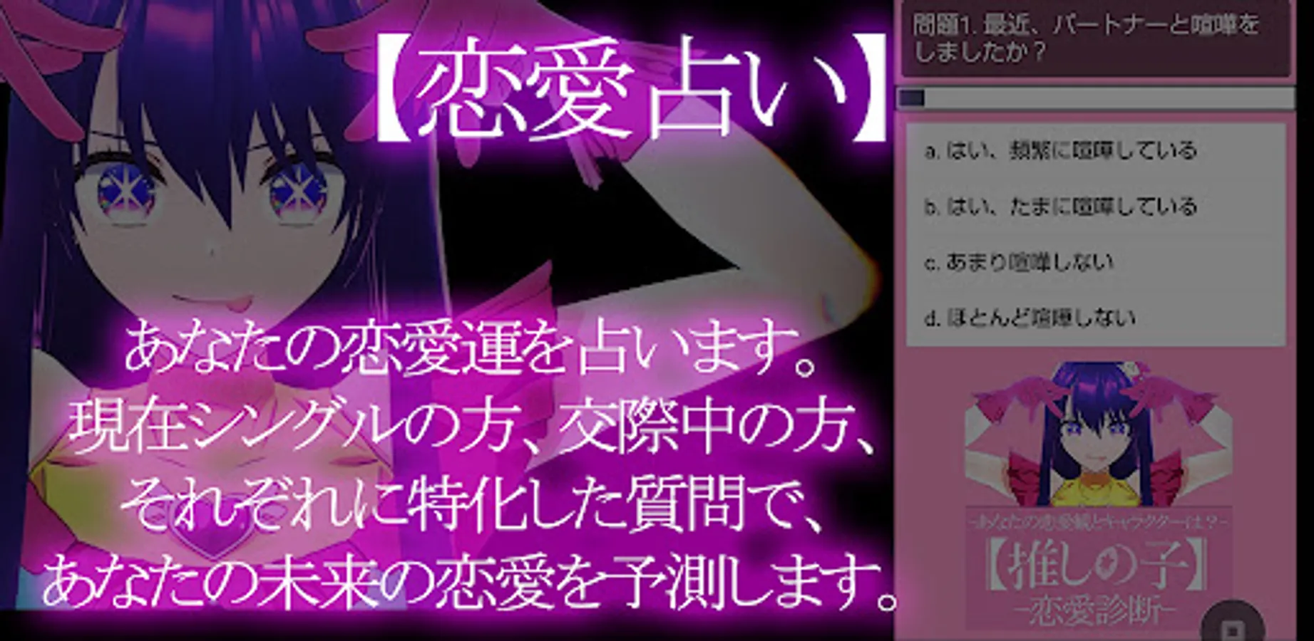 It is a love diagnosis app to make your love more enjoyable and fulfilling. Please download it and diagnose your love!