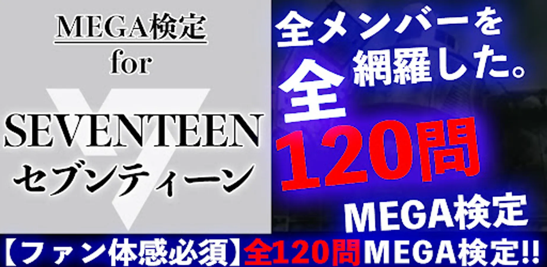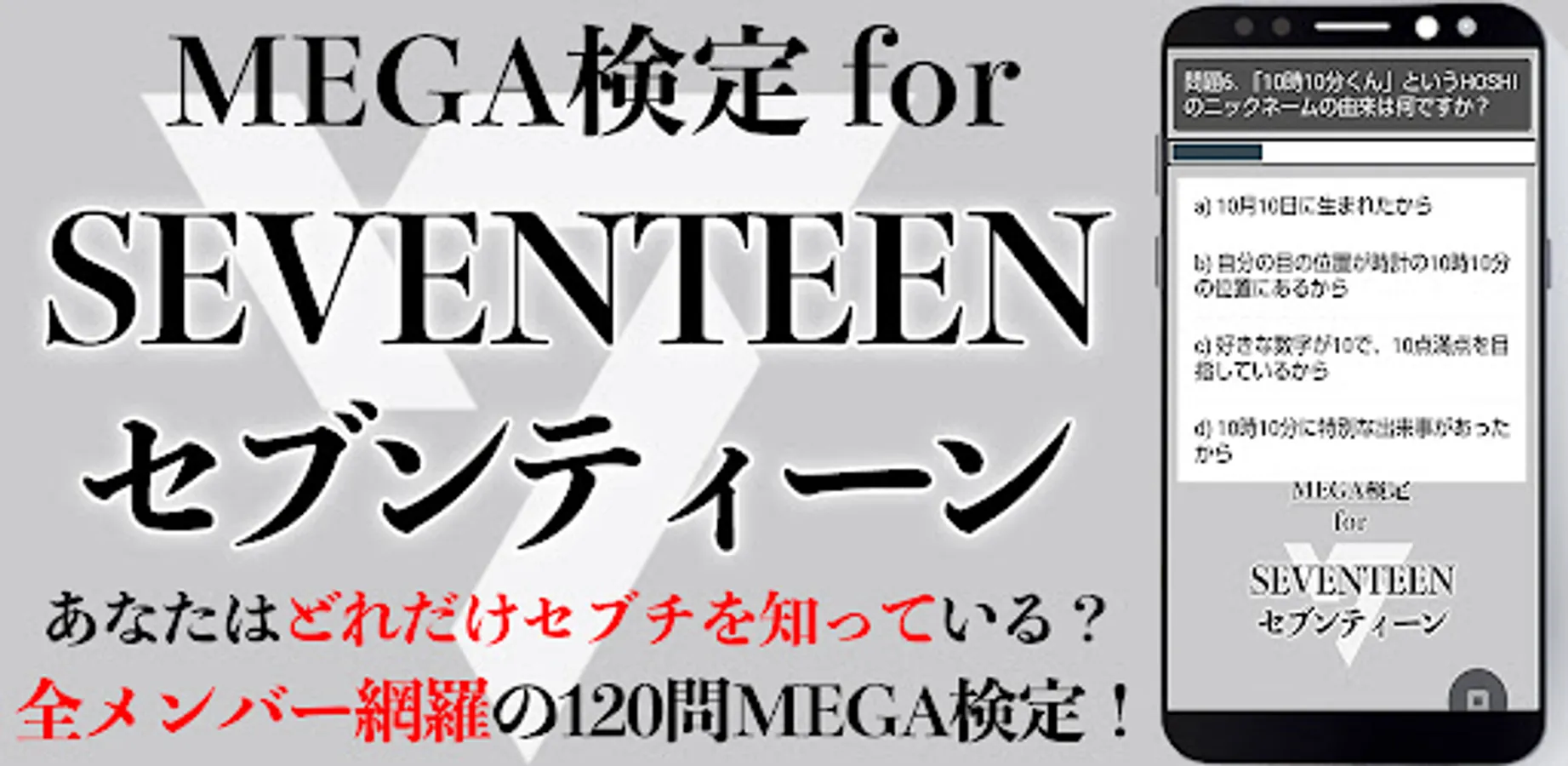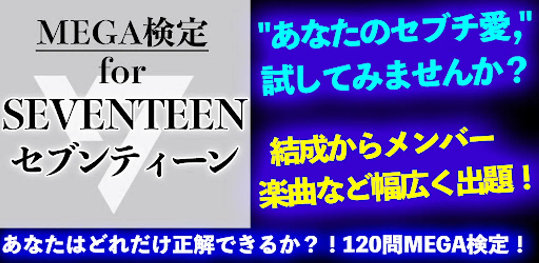 Download "MEGA Kentei for Seventeen" and prove you are a true CARAT! This fun and informative quiz app is full of chances to test your Seventeen knowledge. How many Sebuchi episodes and successes do you know? Let's find out!